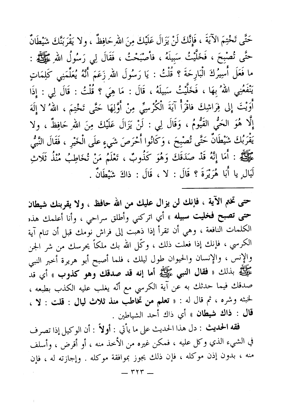 حَتَّى تَخْتِمَ الآيَةَ، فَإِنَّكَ لَنْ يَزَالَ عَلَيْكَ مِنَ اللهِ حَافِظٌ، ولا يَقْرَبَنَّكَ شَيْطَانٌ حتَّى تُصْبِحَ، فَخَلَّيْتُ سَبيلَهُ، فأصْبَحْتُ، فَقَالَ لِي رَسُولُ اللهِ - صلى الله عليه وسلم -: ما فَعَلَ أسِيرُكَ الْبَارِحَةَ؟ قلْتُ: يَا رَسُولَ اللهِ زعَمَ أنَّهُ يُعَلِّمَنِي كَلِمَاتٍ يَنْفَعُنِي اللهُ بِهَا، فَخَلَّيْتُ سَبيلَهُ، قَالَ: مَا هِيَ؟ قُلْتُ: قَالَ لي: إِذَا أَوَيْتَ إِلى فِراشِكَ فاقْرَأْ، آية الْكُرْسِيِّ مِنْ أوَّلِهَا حَتَّى تَخْتِمَ، اللهُ لا إِلَهَ إِلَّا هُوَ الحَيُّ القَيُّومُ، وَقَال لِي: لَنْ يَزَالَ عَلَيْكَ مِنَ اللهِ حَافِظٌ، ولا يَقْرَبُكَ شَيْطَانٌ حَتَّى تُصْبِحَ، وَكَانُوا أَحْرَصَ شَيءٍ علَى الْخَيْرِ، فَقَالَ النَّبيُّ - صلى الله عليه وسلم -: أمَا إِنَّهُ قَدْ صَدَقَكَ وَهُوَ كذوب، تَعْلَمُ مَنْ تُخَاطِبُ مُنْذُ ثَلَاثَ لَيَالٍ يا أبَا هُرَيْرَةَ؟ قَالَ: لا، قَالَ: ذاكَ شَيْطَانٌ.