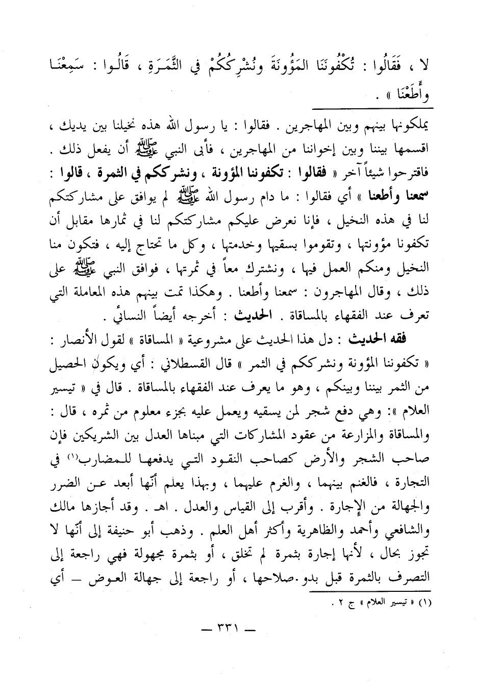 فقه الحديث: دل هذا الحديث على مشروعية " المساقاة " لقول الأنصار: " تكفوننا المؤونة ونشرككم في الثمر " قال القسطلاني: أي ويكون الحصيل من الثمر بيننا وبينكم، وهو ما يعرف عند الفقهاء بالمساقاة. قال في " تيسير العلام ": وهي دفع شجر لمن يسقيه ويعمل عليه بجزء معلوم من ثمره، قال: والمساقاة والمزارعة من عقود المشاركات التي مبناها العدل بين الشريكين فإن صاحب الشجر والأرض كصاحب النقود التي يدفعها للمضارب (¬1) في التجارة، فالغنم بينهما، والغرم عليهما، وبهذا يعلم أنّها أبعد عن الضرر والجهالة من الإِجارة. وأقرب إلى القياس والعدل. اهـ. وقد أجازها مالك والشافعي وأحمد والظاهرية وأكثر أهل العلم. وذهب أبو حنيفة إلى أنّها لا تجوز بحال، لأنها إجارة بثمره لم تخلق، أو بثمرة مجهولة فهي راجعة إلى التصرف بالثمرة قبل بدو صلاحها، أو راجعة إلى جهالة العوض -أي