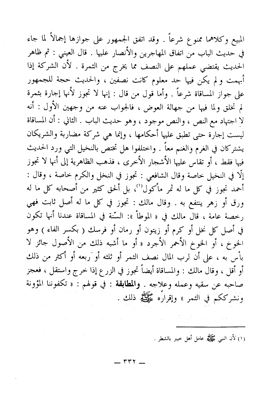 المبيع وكلاهما ممنوع شرعاً. وقد اتفق الجمهور على جوازها إجمالاً لما جاء في حديث الباب من اتفاق المهاجرين والأنصار عليها. قال العيني: ثم ظاهر الحديث يقتضي عملهم على النصف مما يخرج من الثمرة. لأن الشركة إذا أبهمت ولم يكن فيها حد معلوم كانت نصفين، والحديث حجة للجمهور على جواز المساقاة شرعاً. وأما قول من قال: إنها لا تجوز لأنها إجارة بثمرة لم تخلق ولما فيها من جهالة العوض، فالجواب عنه من وجهين الأول: أنه لا اجتهاد مع النص، والنص موجود، وهو حديث الباب. الثاني: أن المساقاة ليست إجارة حتى تطبق عليها أحكامها، وإنما هي شركة مضاربة والشريكان يشتركان في الغرم والغنم معاً. واختلفوا هل تختص بالنخيل التي ورد الحديث فيها فقط، أو تقاس عليها الأشجار الأخرى، فذهب الظاهرية إلى أنها لا تجوز إلّا في النخيل خاصة وقال الشافعي: تجوز في النخل والكرم خاصة، وقال: أحمد تجوز في كل ما له ثمر مأكول (¬1)، بل ألحق كثير من أصحابه كل ما له ورق أو زهر ينتفع به. وقال مالك: تجوز في كل ما له أصل ثابت فهي رخصة عامة، قال مالك في " الموطأ ": السّنة في المساقاة عندنا أنها تكون في أصل كل نخل أو كرم أو زيتون أو رمان أو فرسك (بكسر الفاء) وهو الخوخ، أو الخوخ الأحمر الأجرد " أو ما أشبه ذلك من الأصول جائز لا بأس به، على أن لرب المال نصف الثمر أو ثلثه أو ربعه أو أكثر من ذلك أو أقل، وقال مالك: والمساقاة أيضاًً تجوز في الزرع إذا خرج واستقل، فعجز صاحبه عن سقيه وعمله وعلاجه. والمطابقة: في قولهم: " تكفوننا المؤونة ونشرككم في الثمر " وإقراره - صلى الله عليه وسلم - ذلك.
