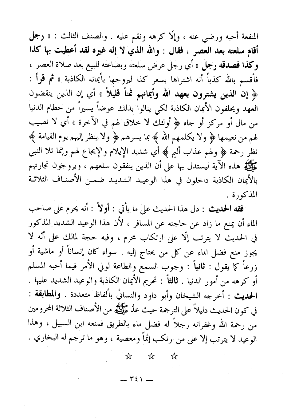 المنفعة أحبه ورضي عنه، وإلا كرهه ونقم عليه. والصنف الثالث: " رجل أقام سلعته بعد العصر، فقال: والله الذي لا إله غيره لقد أعطيت بها كذا وكذا فصدقه رجل " أي رجل عرض سلعته وبضاعته للبيع بعد صلاة العصر، فأقسم بالله كذباً أنه اشتراها بسعر كذا ليروجها بأيمانه الكاذبة " ثم قرأ: (إِنَّ الَّذِينَ يَشْتَرُونَ بِعَهْدِ اللَّهِ وَأَيْمَانِهِمْ ثَمَنًا قَلِيلًا) " أي إن الذين ينقضون العهد ويحلفون الأيمان الكاذبة لكي ينالوا بذلك عوضاً يسيراً من حطام الدنيا من مال أو مركز أو جاه (أُولَئِكَ لَا خَلَاقَ لَهُمْ فِي الْآَخِرَةِ) أي لا نصيب لهم من نعيمها (وَلَا يُكَلِّمُهُمُ اللَّهُ) بما يسرهم (وَلَا يَنْظُرُ إِلَيْهِمْ يَوْمَ الْقِيَامَةِ) نظر رحمة (وَلَهُمْ عَذَابٌ أَلِيمٌ) أي شديد الإِيلام والإِيجاع لهم وإنما تلا النبي - صلى الله عليه وسلم - هذه الآية ليستدل بها، على أن الذين ينفقون سلعهم، ويروجون تجارتهم بالأيمان الكاذبة داخلون في هذا الوعيد الشديد ضمن الأصناف الثلاثة المذكورة.