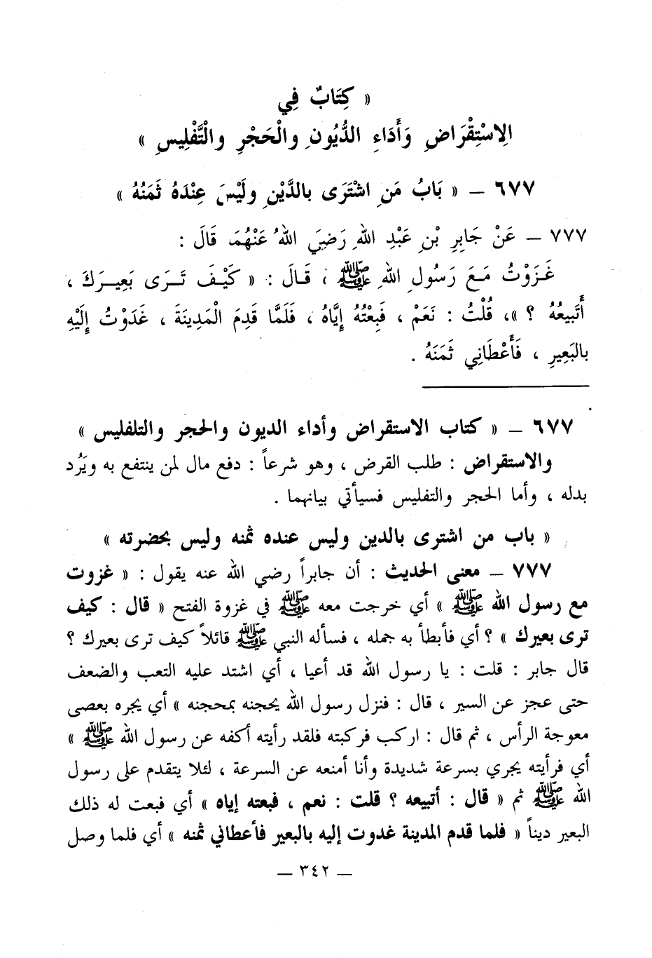 777 - معنى الحديث: أن جابراً رضي الله عنه يقول: " غزوت مع رسول الله - صلى الله عليه وسلم - " أي خرجت معه - صلى الله عليه وسلم - في غزوة الفتح " قال: كيف ترى بعيرك "؟ أي فأبطأ به جمله، فسأله النبي - صلى الله عليه وسلم - قائلاً كيف ترى بعيرك؟ قال جابر: قلت: يا رسول الله قد أعيا، أي اشتد عليه التعب والضعف حتى عجز عن السير، قال: فنزل رسول الله يحجنه بمحجنه " أي يجره بعصى معوجة الرأس، ثم قال: اركب فركبته فلقد رأيته أكفه عن رسول الله - صلى الله عليه وسلم - " أي فرأيته يجري بسرعة شديدة وأنا أمنعه عن السرعة، لئلا يتقدم على رسول الله - صلى الله عليه وسلم - ثم " قال: أتبيعه؟ قلت: نعم، فبعته إياه " أي فبعت له ذلك البعير ديناً " فلما قدم المدينة غدوت إليه بالبعير فأعطاني ثمنه " أي فلما وصل
