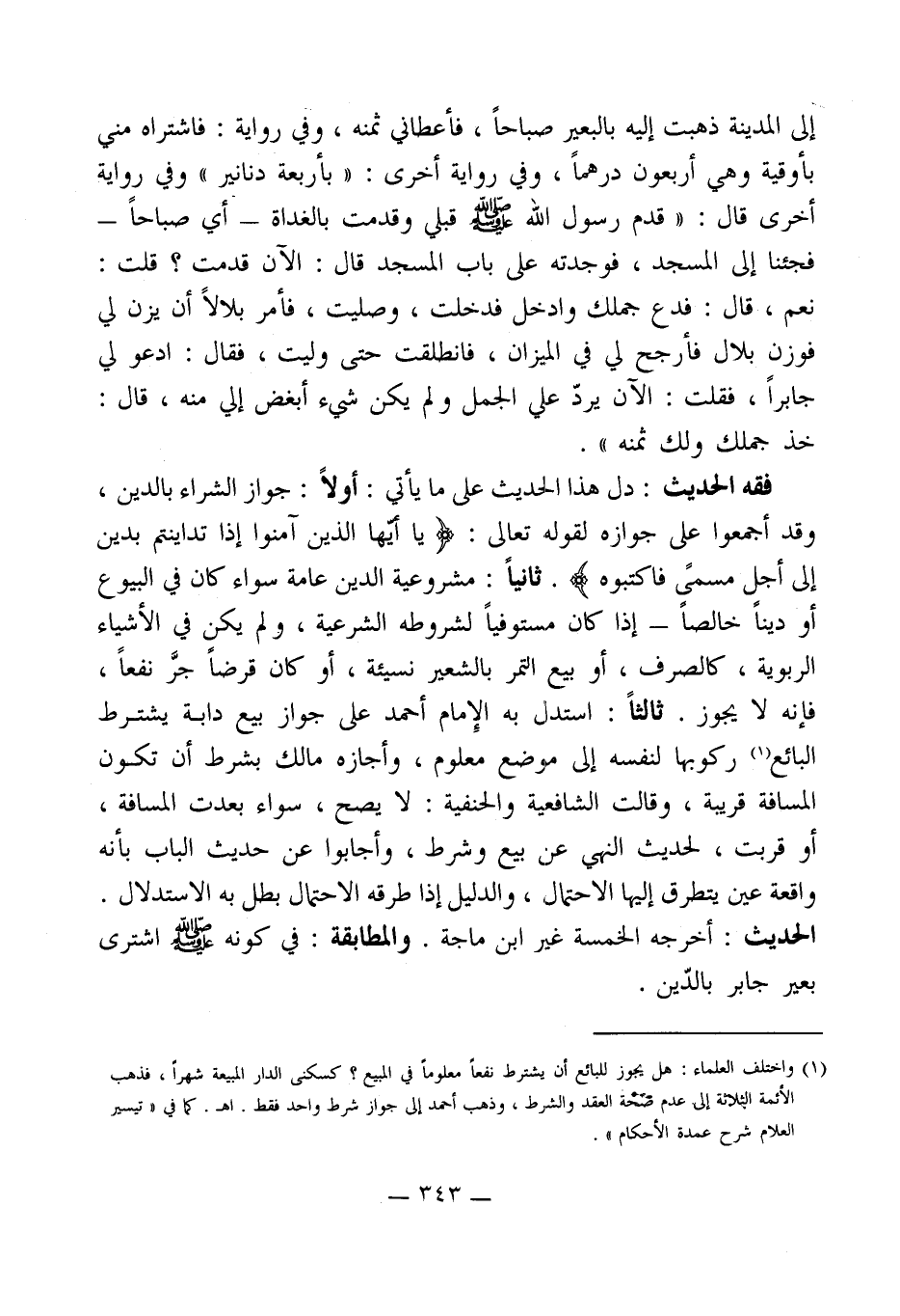 فقه الحديث: دل هذا الحديث على ما يأتي: أولاً: جواز الشراء بالدين، وقد أجمعوا على جوازه لقوله تعالى: (يَا أَيُّهَا الَّذِينَ آمَنُوا إِذَا تَدَايَنْتُمْ بِدَيْنٍ إِلَى أَجَلٍ مُسَمًّى فَاكْتُبُوهُ). ثانياًًً: مشروعية الدين عامة سواء كان في البيوع أو ديناً خالصاً - إذا كان مستوفياً لشروطه الشرعية، ولم يكن في الأشياء الربوية، كالصرف، أو بيع التمر بالشعير نسيئة، أو كان قرضاً جرَّ نفعاً، فإنه لا يجوز. ثالثاً: استدل به الإِمام أحمد على جواز بيع دابة يشترط البائع (¬1) ركوبها لنفسه إلى موضع معلوم، وأجازه مالك بشرط أن تكون المسافة قريبة، وقالت الشافعية والحنفية: لا يصح، سواء بعدت المسافة، أو قربت، لحديث النهي عن بيع وشرط، وأجابوا عن حديث الباب بأنه واقعة عين يتطرق إليها الاحتمال، والدليل إذا طرقه الاحتمال بطل به الاستدلال.