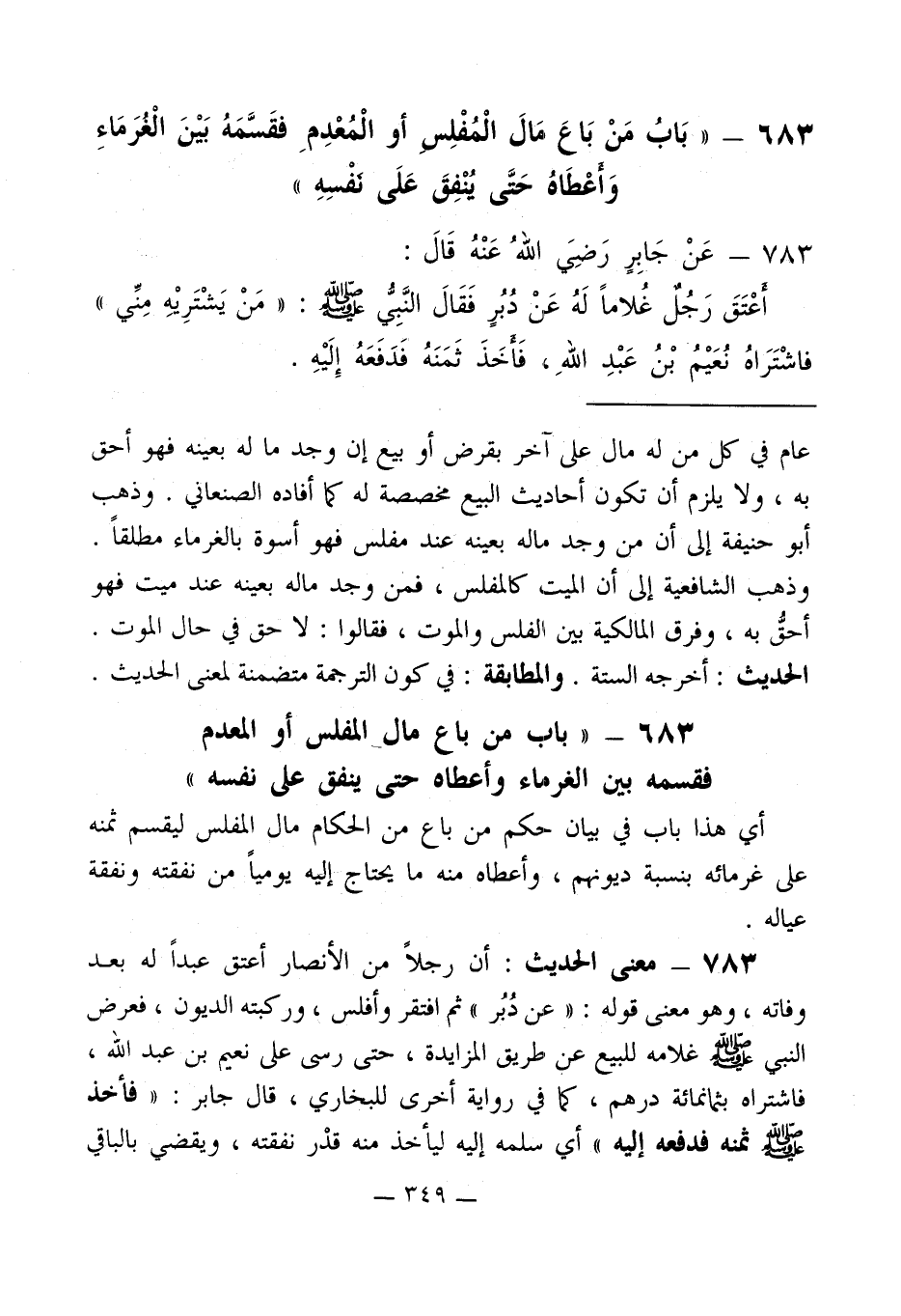783 - معنى الحديث: أن رجلاً من الأنصار أعتق عبداً له بعد وفاته، وهو معنى قوله: " عن دُبُر " ثم افتقر وأفلس، وركبته الديون، فعرض النبي - صلى الله عليه وسلم - غلامه للبيع في طريق المزايدة، حتى رسى على نعيم بن عبد الله، فاشتراه بثمانمائة درهم، كما في رواية أخرى للبخاري، قال جابر: " فأخذ - صلى الله عليه وسلم - ثمنه فدفعه إليه " أي سلمه إليه ليأخذ منه قدْر نفقته، ويقضي بالباقي