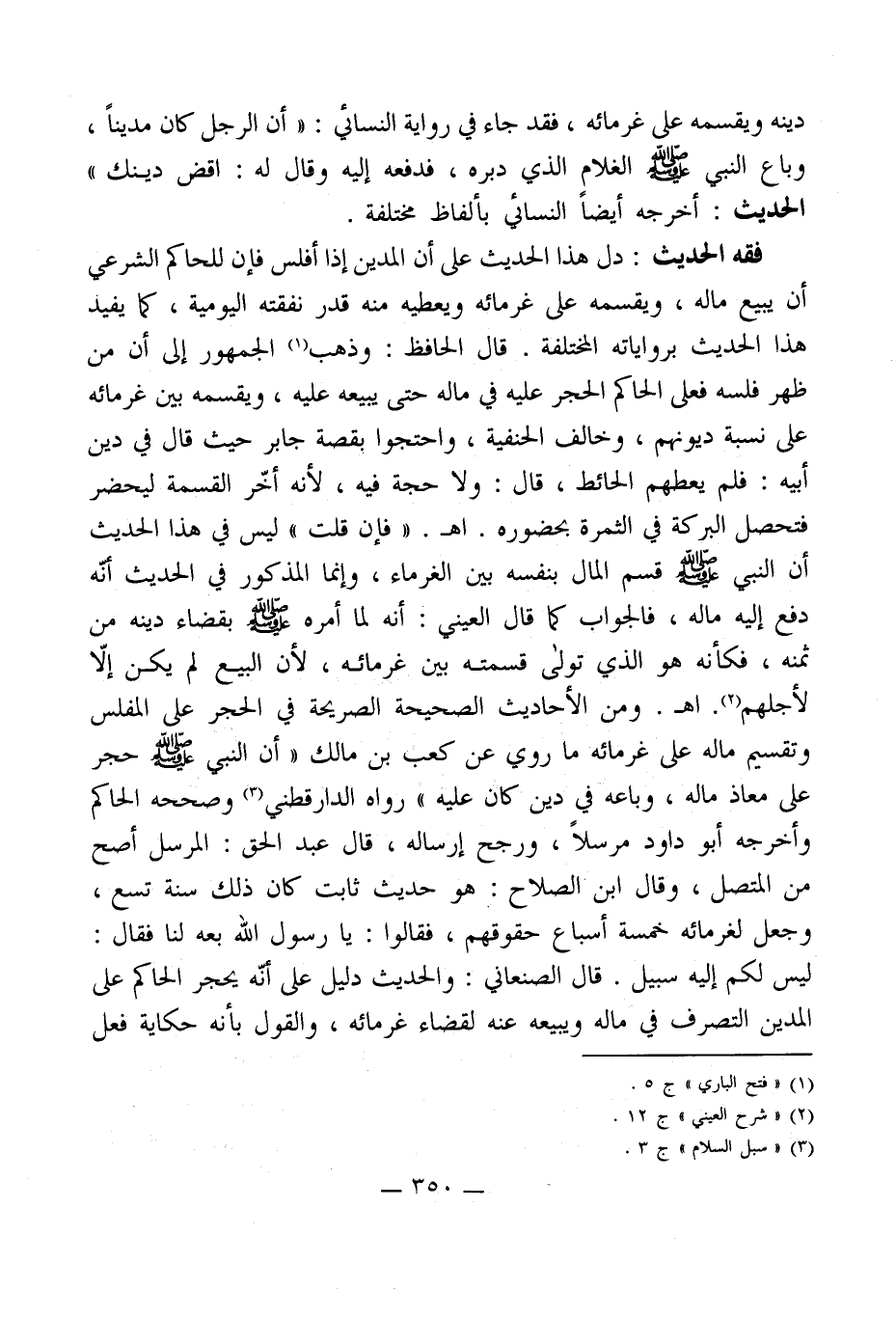 فقه الحديث: دل هذا الحديث على أن المدين إذا أفلس فإن للحاكم الشرعي أن يبيع ماله، ويقسمه على غرمائه ويعطيه منه قدر نفقته اليومية، كما يفيد هذا الحديث برواياته المختلفة. قال الحافظ: وذهب (¬1) الجمهور إلى أن من ظهر فلسه فعلى الحاكم الحجر عليه في ماله حتى يبيعه عليه، ويقسمه بين غرمائه على نسبة ديونهم، وخالف الحنفية، واحتجوا بقصة جابر حيث قال في دين أبيه: فلم يعطهم الحائط، قال: ولا حجة فيه، لأنه أخّر القسمة ليحضر فتحصل البركة في الثمرة بحضوره. اهـ. " فإن قلت " ليس في هذا الحديث أن النبي - صلى الله عليه وسلم - قسم المال بنفسه بين الغرماء، وإنما المذكور في الحديث أنّه دفع إليه ماله، فالجواب كما قال العيني: أنه لما أمره - صلى الله عليه وسلم - بقضاء دينه من ثمنه، فكأنه هو الذي تولى قسمته بين غرمائه، لأن البيع لم يكن إلّا لأجلهم (¬2). اهـ. ومن الأحاديث الصحيحة الصريحة في الحجر على المفلس وتقسيم ماله على غرمائه ما روي عن كعب بن مالك " أن النبي - صلى الله عليه وسلم - حجر على معاذ ماله، وباعه في دين كان عليه " رواه الدارقطني (¬3) وصححه الحاكم وأخرجه أبو داود مرسلاً، ورجح إرساله، قال عبد الحق: المرسل أصح من المتصل، وقال ابن الصلاح: هو حديث ثابت كان ذلك سنة تسع، وجعل لغرمائه خمسة أسباع حقوقهم، فقالوا: يا رسول الله بعه لنا فقال: ليس لكم إليه سبيل. قال الصنعاني: والحديث دليل على أنه يحجر الحاكم على المدين التصرف في ماله ويبيعه عنه لقضاء غرمائه، والقول بأنه حكاية فعل