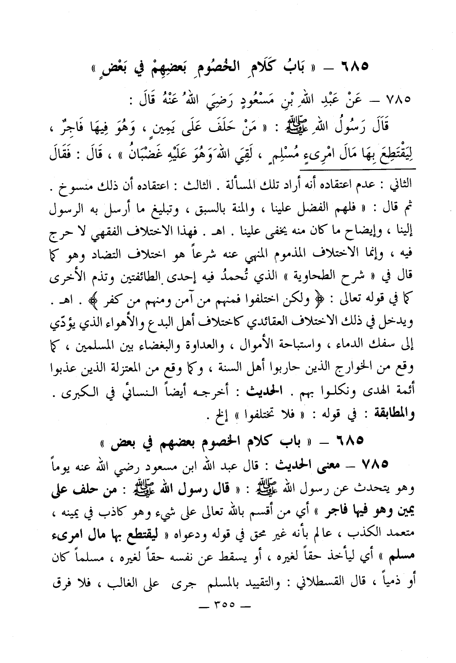 785 - معنى الحديث: قال عبد الله ابن مسعود رضي الله عنه يوماً وهو يتحدث عن رسول الله - صلى الله عليه وسلم -: " قال رسول الله - صلى الله عليه وسلم -: من حلف على يمين وهو فيها فاجر " أي من أقسم بالله تعالى على شيء وهو كاذب في يمينه، متعمد الكذب، عالم بأنه غير محق في قوله ودعواه " ليقتطع بها مال امرىء مسلم " أي ليأخذ حقاً لغيره، أو يسقط عن نفسه حقاً لغيره، مسلماً كان أو ذمياً، قال القسطلاني: والتقييد بالمسلم جرى على الغالب، فلا فرق