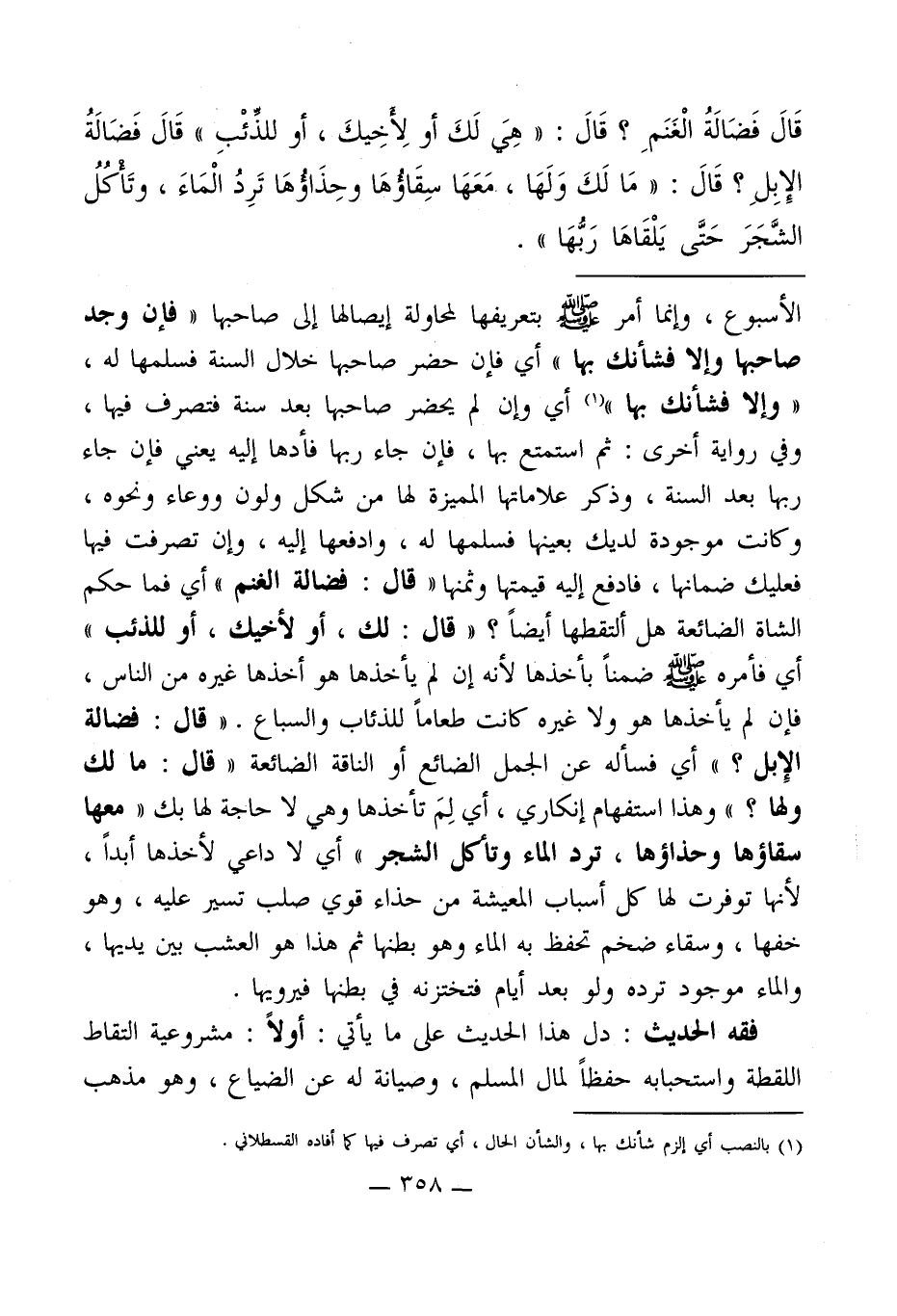 الأسبوع، وإنما أمر - صلى الله عليه وسلم - بتعريفها لمحاولة إيصالها إلى صاحبها " فإن وجد صاحبها وإلا فشأنك بها " أي فإن حضر صاحبها خلال السنة فسلمها له، " وإلا فشأنك بها " (¬1) أي وإن لم يحضر صاحبها بعد سنة فتصرف فيها، وفي رواية أخرى: ثم استمتع بها، فإن جاء ربها فأدها إليه يعني فإن جاء ربها بعد السنة، وذكر علاماتها المميزة لها من شكل ولون ووعاء ونحوه، وكانت موجودة لديك بعينها فسلمها له، وادفعها إليه، وإن تصرفت فيها فعليك ضمانها، فادفع إليه قيمتها وثمنها " قال: فضالة الغنم " أي فما حكم الشاة الضائعة هل ألتقطها أيضاًً؟ " قال: لك، أو لأخيك، أو للذئب " أي فأمره - صلى الله عليه وسلم - ضمناً بأخذها لأنه إن لم يأخذها هو أخذها غيره من الناس، فإن لم يأخذها هو ولا غيره كانت طعاماً للذئاب والسباع. " قال: فضالة الإِبل؟ " أي فسأله عن الجمل الضائع أو الناقة الضائعة " قال: ما لك ولها؟ " وهذا استفهام إنكاري، أي لِمَ تأخذها وهي لا حاجة لها بك " معها سقاؤها وحذاؤها، ترد الماء وتأكل الشجر " أي لا داعي لأخذها أبداً، لأنها توفرت لها كل أسباب المعيشة من حذاء قوي صلب تسير عليه، وهو خفها، وسقاء ضخم تحفظ به الماء وهو بطنها ثم هذا هو العشب بين يديها، والماء موجود ترده ولو بعد أيام فتختزنه في بطنها فيرويها.