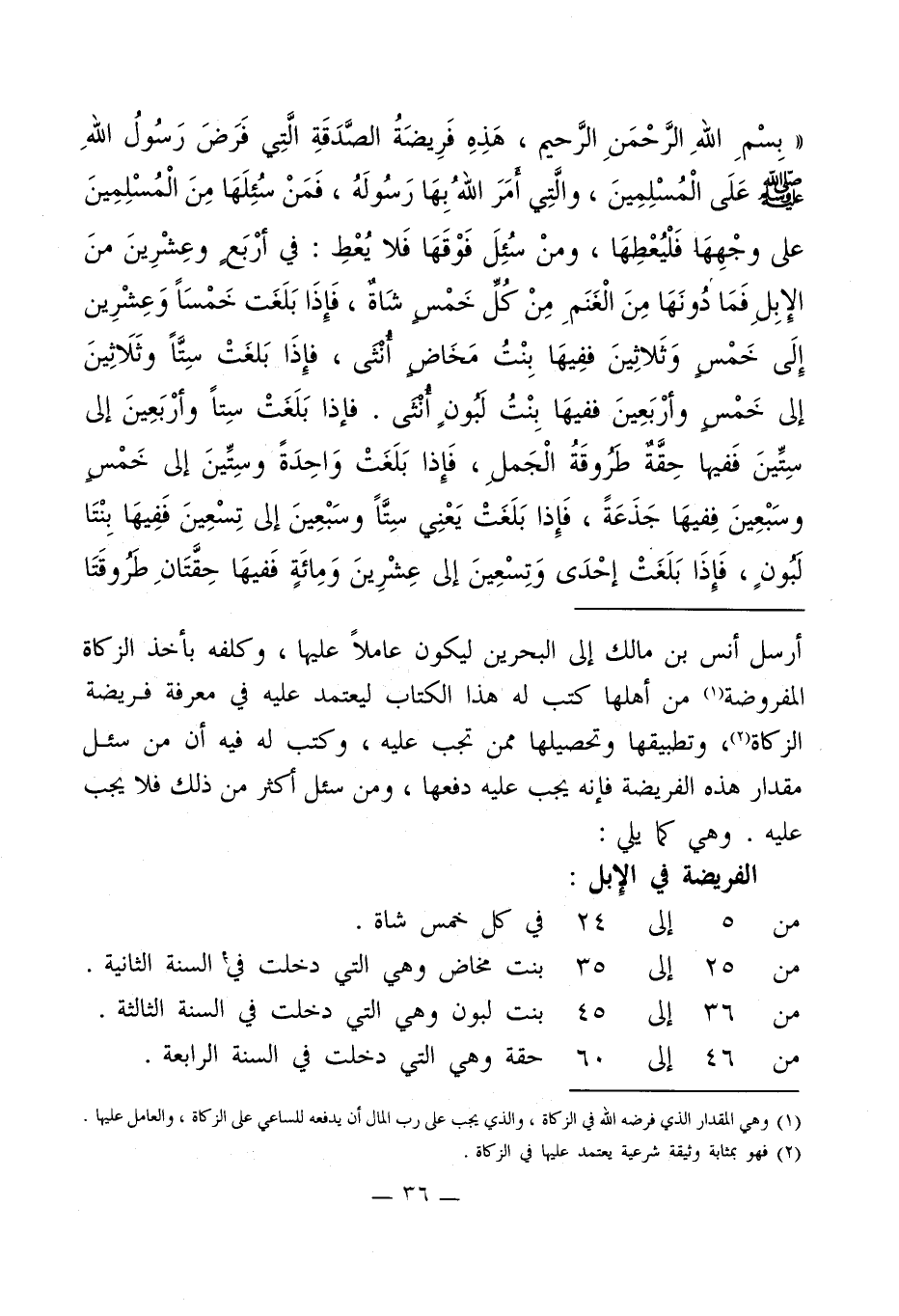 " بسْمِ اللهِ الرَّحْمَنِ الرَّحيم، هَذِهِ فَرِيضَةُ الصَّدَقَةِ الَّتِى فَرَضَ رَسُولُ اللهِ - صلى الله عليه وسلم - عَلَى الْمُسْلِمِينَ، والَّتِي أَمرَ اللهُ بِهَا رَسُولَهُ، فَمَنْ سُئِلَهَا مِنَ الْمُسْلِمِينَ على وجْهِهَا فَلْيُعْطِهَا، ومنْ سُئِلَ فَوْقَهَا فَلا يُعْطِ: في أرْبَع وعِشْرِينَ منَ الإِبِلِ فَمَاَ دُونَهَا مِنَ الْغَنَمِ مِنْ كُلِّ خَمْس شَاةٌ، فَإِذَا بَلَغَت خَمْسَاً وَعِشْرِين إِلَى خَمسٍ وَثَلاثِينَ ففِيهَا بِنْتُ مَخَاض أُنثى، فإِذَا بَلغَتْ سِتَّاً وثَلَاثِينَ إلى خَمسٍ وأرْبَعِينَ ففيهَا بِنْتُ لبون أُنثى. فإذا بَلَغَتْ سِتاً وأرْبَعِينَ إلى سِتِّينَ فَفيها حِقَّةٌ طروقَةُ الْجَملِ، فَإِذا بَلَغَتْ وَاحِدَةً وسِتِّينَ إلى خَمسٍ وسَبْعِينَ فِفيهَا جَذَعَةً، فَإِذا بَلَغَتْ يَعْنِي سِتَّاً وسَبْعِينَ إلى تِسْعِينَ فَفِيهَا بِنْتَا لبونٍ، فَإذَا بَلَغَتْ إحْدَى وَتسْعينَ إِلى عشْرينَ وَمائَةٍ فَفيهَا حقَّتَان طروقَتَا
