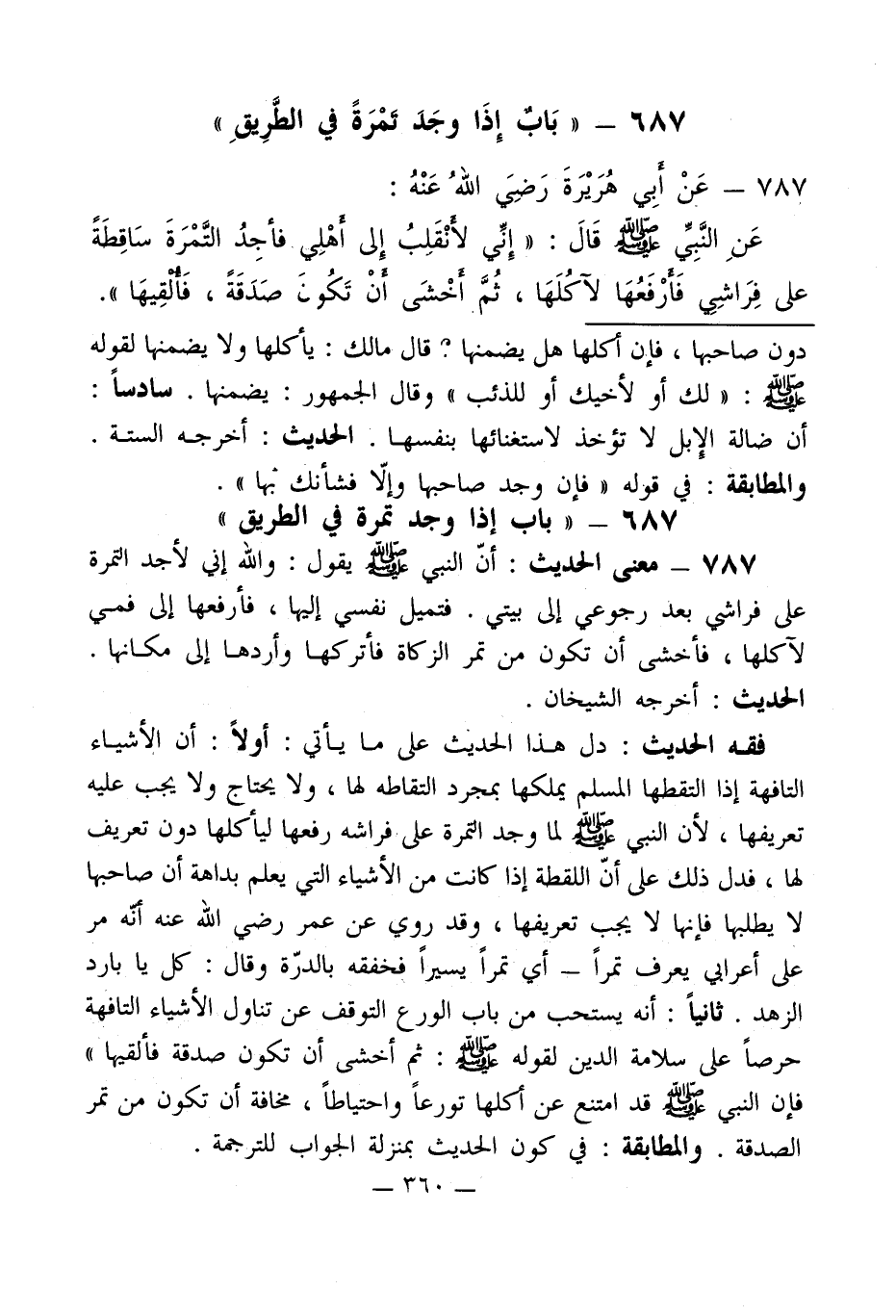 787 - معنى الحديث: أنّ النبي - صلى الله عليه وسلم - يقول: والله إني لأجد التمرة على فراشي بعد رجوعي إلى بيتي. فتميل نفسي إليها، فأرفعها إلى فمي لآكلها، فأخشى أن تكون من تمر الزكاة فأتركها وأردها إلى مكانها. الحديث: أخرجه الشيخان.