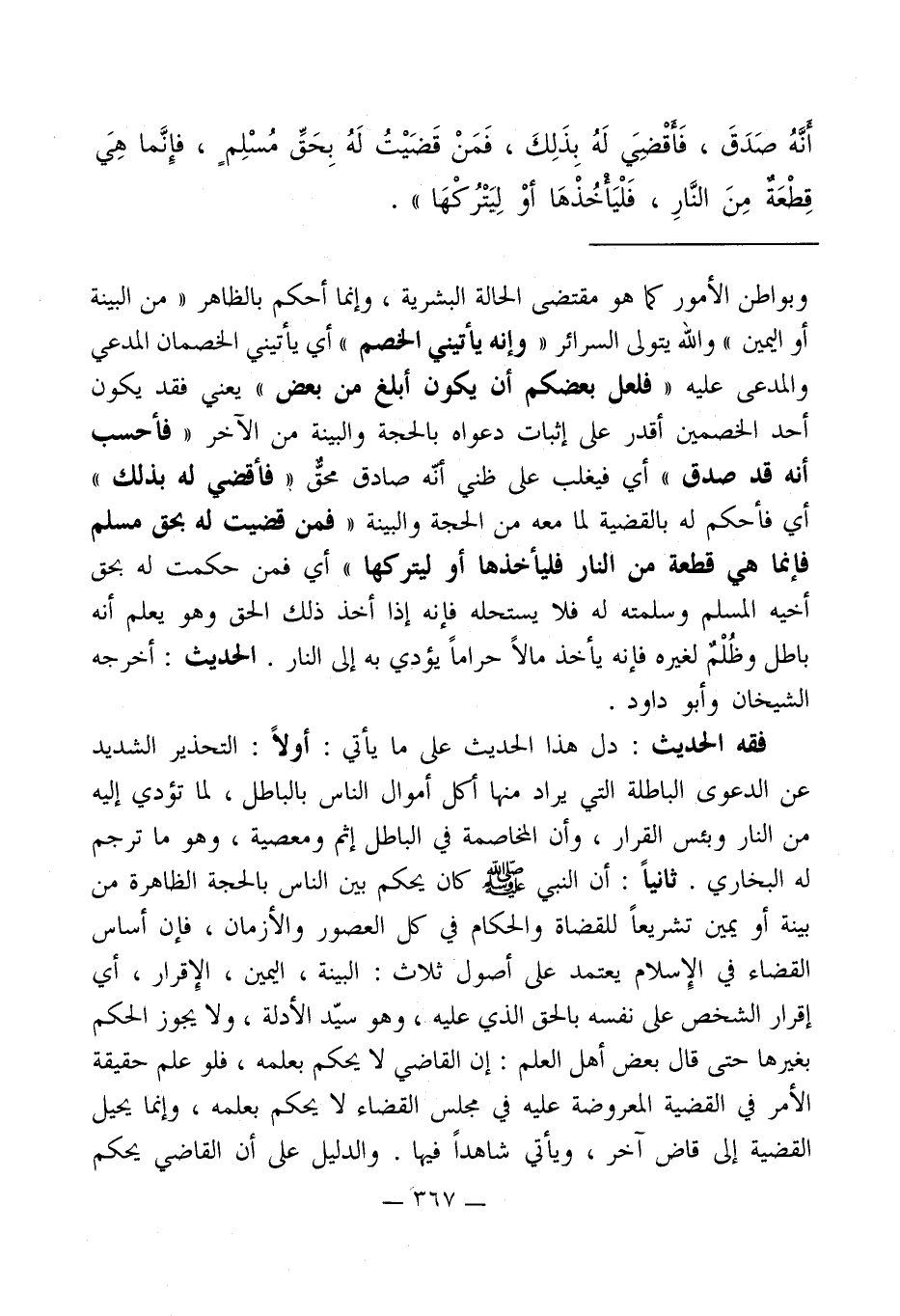 فقه الحديث: دل هذا الحديث على ما يأتي: أولاً: التحذير الشديد عن الدعوى الباطلة التي يراد منها أكل أموال الناس بالباطل، لما تؤدي إليه من النار وبئس القرار، وأن المخاصمة في الباطل إثم ومعصية، وهو ما ترجم له البخاري. ثانياًً: أن النبي - صلى الله عليه وسلم - كان يحكم بين الناس بالحجة الظاهرة من بينة أو يمين تشريعاً للقضاة والحكام في كل العصور والأزمان، فإن أساس القضاء في الإِسلام يعتمد على أصول ثلاث: البينة، اليمين، الإِقرار، أي إقرار الشخص على نفسه بالحق الذي عليه، وهو سيّد الأدلة، ولا يجوز الحكم بغيرها حتى قال بعض أهل العلم: إن القاضي لا يحكم بعلمه، فلو علم حقيقة الأمر في القضية المعروضة عليه في مجلس القضاء لا يحكم بعلمه، وإنما يحيل القضية إلى قاض آخر، ويأتي شاهداً فيها. والدليل على أن القاضي يحكم