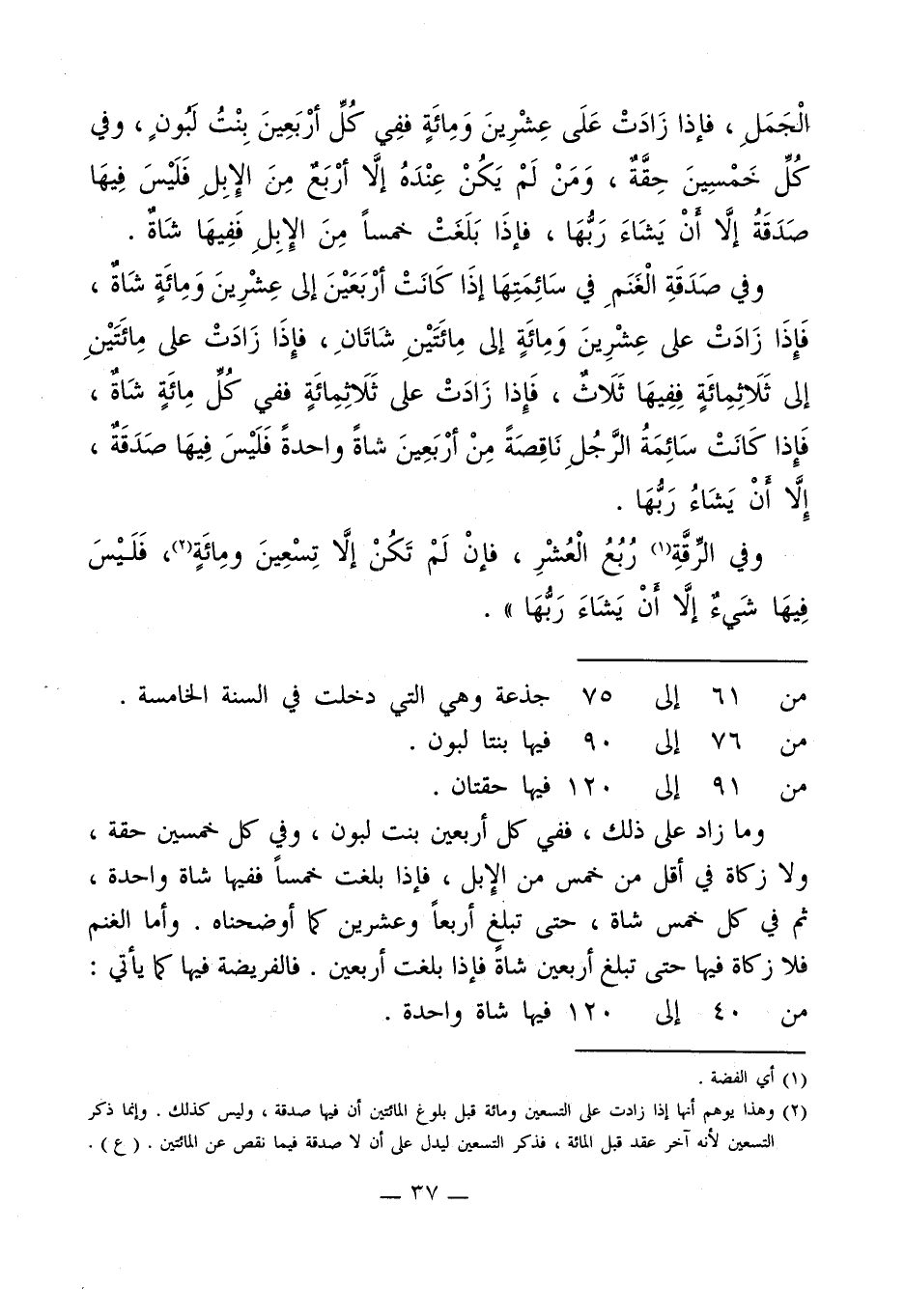 وما زاد على ذلك، ففي كل أربعين بنت لبون، وفي كل خمسين حقة، ولا زكاة في أقل من خمس من الإِبل، فإذا بلغت خمساً ففيها شاة واحدة، ثم في كل خمس شاة، حتى تبلغ أربعاً وعشرين كما أوضحناه. وأما الغنم فلا زكاة فيها حتى تبلغ أربعين شاة فإذا بلغت أربعين. فالفريضة فيها كما يأتي: