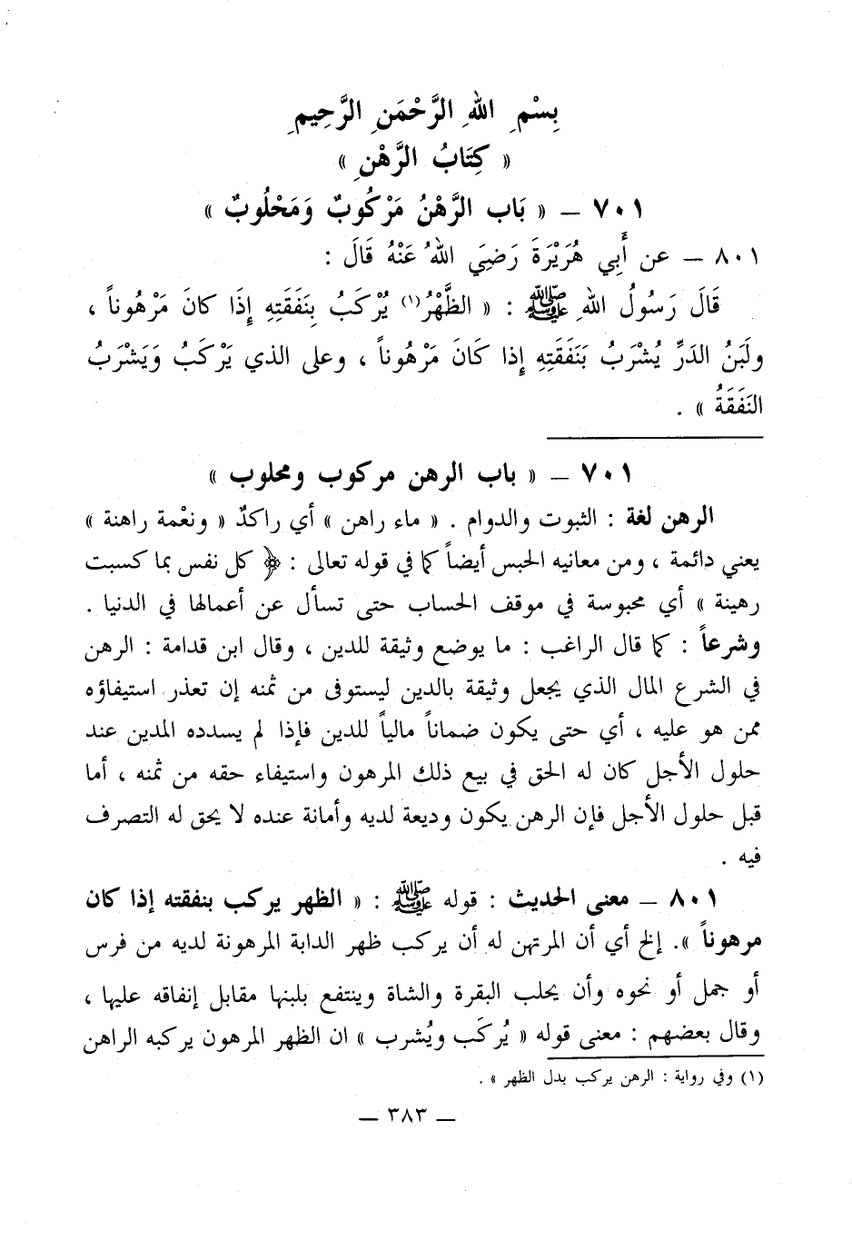 801 - معنى الحديث: قوله - صلى الله عليه وسلم -: " الظهر يركب بنفقته إذا كان مرهوناً ". إلخ أي أن المرتهن له أن يركب ظهر الدابة المرهونة لديه من فرس أو جمل أو نحوه وأن يحلب البقرة والشاة وينتفع بلبنها مقابل إنفاقه عليها، وقال بعضهم: معنى قوله " يُركَب ويُشرب " أن الظهر المرهون يركبه الراهن