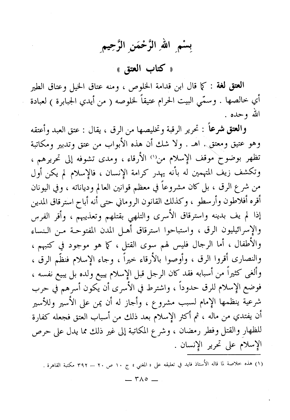 والعتق شرعاً: تحرير الرقبة وتخليصها من الرق، يقال: عتق العبد وأعتقه وهو عتيق ومعتق. اهـ. ولا شك أن هذه الأبواب من عتق وتدبير ومكاتبة تظهر بوضوح موقف الإِسلام من (¬1) الأرقاء، ومدى تشوفه إلى تحريرهم، وتكشف زيف المتهمين له بأنه يهدر كرامة الإِنسان، فالإِسلام لم يكن أول من شرع الرق، بل كان مشروعاً في معظم قوانين العالم ودياناته، وفي اليونان أقره أفلاطون وأرسطو، وكذلك القانون الروماني حتى أنه أباح استرقاق المدين إذا لم يف بدينه واسترقاق الأسرى والتلهي بقتلهم وتعذيبهم، وأقر الفرس والإِسرائيليون الرق، واستباحوا استرقاق أهل المدن المفتوحة من النساء والأطفال، أما الرجال فليس لهم سوى القتل، كما هو موجود في كتبهم، والنصارى أقروا الرق، وأوصوا بالأرقاء خيراً، وجاء الإِسلام فنظّم الرق، وألغى كثيراً من أسبابه فقد كان الرجل قبل الإِسلام يبيع ولده بل يبيع نفسه، فوضع الإِسلام للرق حدوداً، واشترط في الأسرى أن يكون أسرهم في حرب شرعية ينظمها الإِمام لسبب مشروع، وأجاز له أن يمن على الأسير وللأسير أن يفتدي من ماله، ثم أكثر الإِسلام بعد ذلك من أسباب العتق فجعله كفارة للظهارِ والقتل وفطر رمضان، وشرع المكاتبة إلى غير ذلك مما يدل على حرص الإِسلام على تحرير الإِنسان.