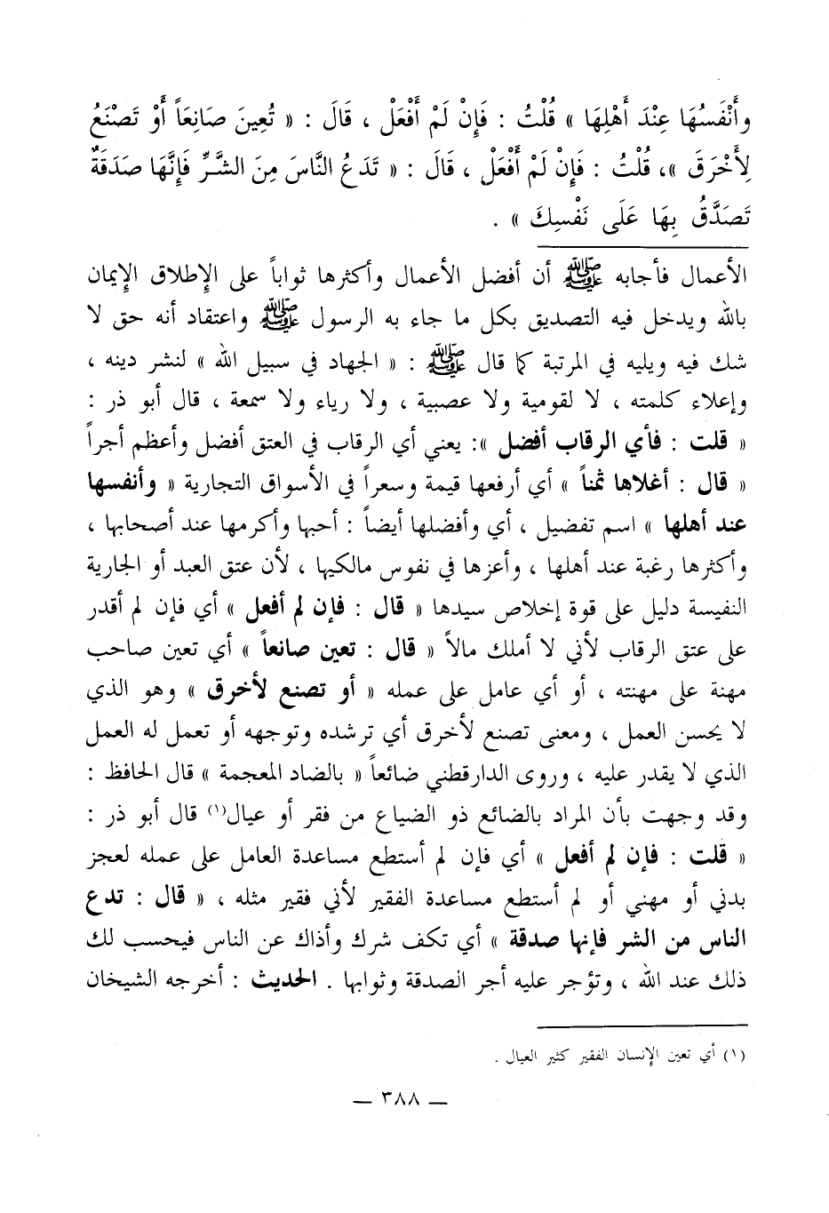 الأعمال فأجابه - صلى الله عليه وسلم - أن أفضل الأعمال وأكثرها ثواباً على الإِطلاق الإِيمان بالله ويدخل فيه التصديق بكل ما جاء به الرسول - صلى الله عليه وسلم - واعتقاد أنه حق لا شك فيه ويليه في المرتبة كما قال - صلى الله عليه وسلم -: " الجهاد في سبيل الله " لنشر دينه، وإعلاء كلمته، لا لقومية ولا عصبية، ولا رياء ولا سمعة، قال أبو ذر: " قلت: فأي الرقاب أفضل ": يعني أي الرقاب في العتق أفضل وأعظم أجراً " قال: أغلاها ثمناً " أي أرفعها قيمة وسعراً في الأسواق التجارية " وأنفسها عند أهلها " اسم تفضيل، أي وأفضلها أيضاًً: أحبها وأكرمها عند أصحابها، وأكثرها رغبة عند أهلها، وأعزها في نفوس مالكيها، لأن عتق العبد أو الجارية النفيسة دليل على قوة إخلاص سيدها " قال: فإن لم أفعل " أي فإن لم أقدر على عتق الرقاب لأني لا أملك مالاً " قال: تعين صانعاً " أي تعين صاحب مهنة على مهنته، أو أي عامل على عمله " أو تصنع لأخرق " وهو الذي لا يحسن العمل، ومعنى تصنع لأخرق أي ترشده وتوجهه أو تعمل له العمل الذي لا يقدر عليه، وروى الدارقطني ضائعاً " بالضاد المعجمة " قال الحافظ: وقد وجهت بأن المراد بالضائع ذو الضياع من فقر أو عيال (¬1) قال أبو ذر: " قلت: فإن لم أفعل " أي فإن لم أستطع مساعدة العامل على عمله لعجز بدني أو مهني أو لم أستطع مساعدة الفقير لأني فقير مثله، " قال: تدع الناس من الشر فإنها صدقة " أي تكف شرك وأذاك عن الناس فيحسب لك ذلك عند الله، وتؤجر عليه أجر الصدقة وثوابها. الحديث: أخرجه الشيخان