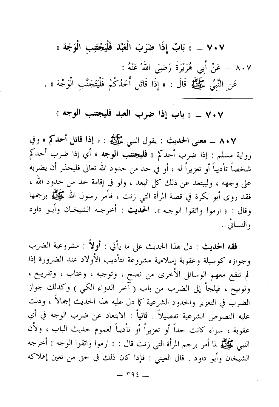 807 - معنى الحديث: يقول النبي - صلى الله عليه وسلم -: " إذا قاتل أحدكم " وفي رواية مسلم: إذا ضرب أحدكم " فليجتنب الوجه " أي إذا ضرب أحدكم شخصاً تأديباً أو تعزيراً له، أو في حد من حدود الله تعالى فليحذر أن يضربه على وجهه، وليبتعد عن ذلك كل البعد، ولو في إقامة حد من حدود الله، فقد روى أبو بكرة في قصة المرأة التي زنت، فأمر رسول الله - صلى الله عليه وسلم - برجمها وقال: " ارموا واتقوا الوجه ". الحديث: أخرجه الشيخان وأبو داود والنسائي.