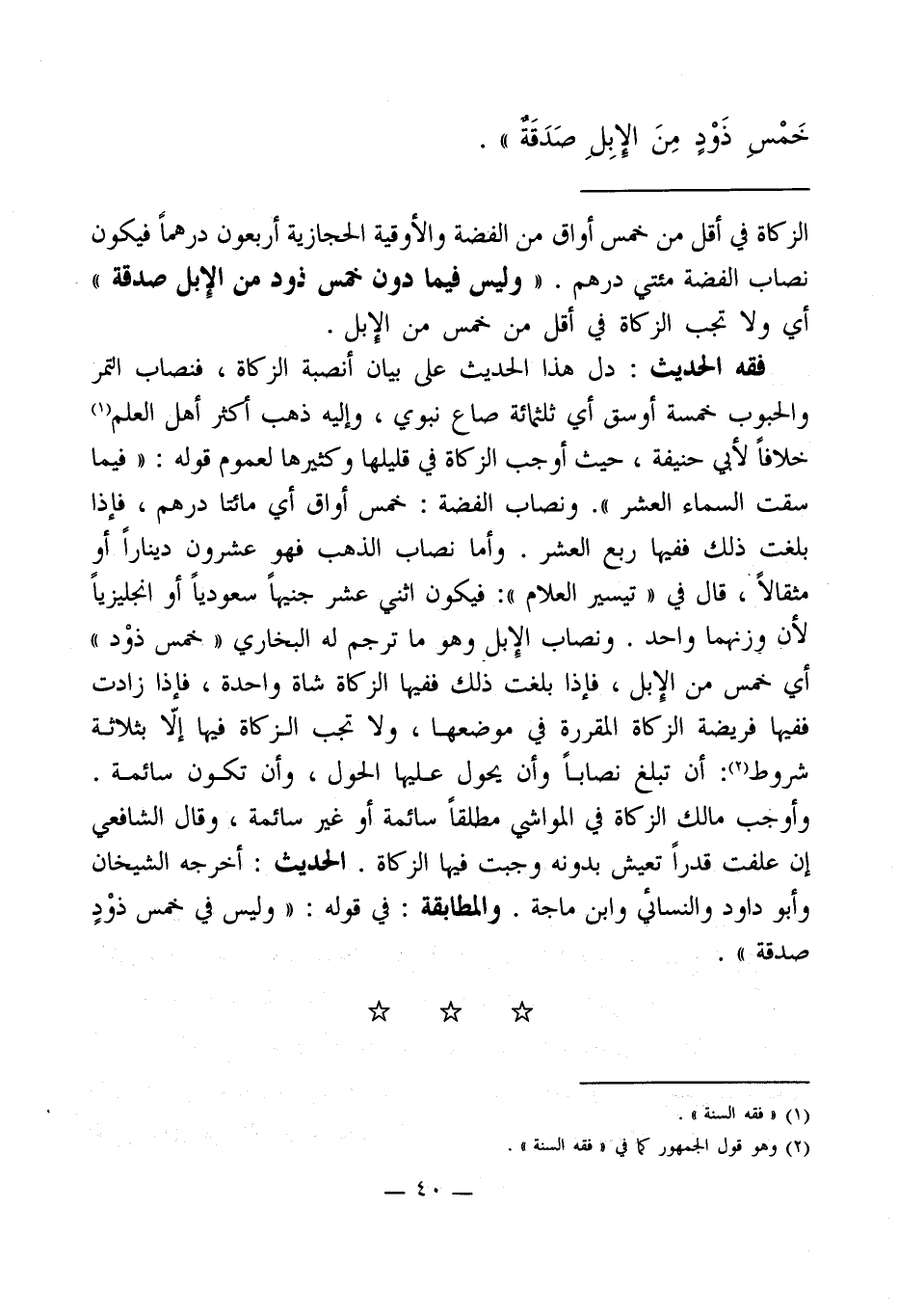 الزكاة في أقل من خمس أواق من الفضة والأوقية الحجازية أربعون درهماً فيكون نصاب الفضة مئتي درهم. " وليس فيما دون خمس ذود من الِإبل صدقة " أي ولا تجب الزكاة في أقل من خمس من الإبل.