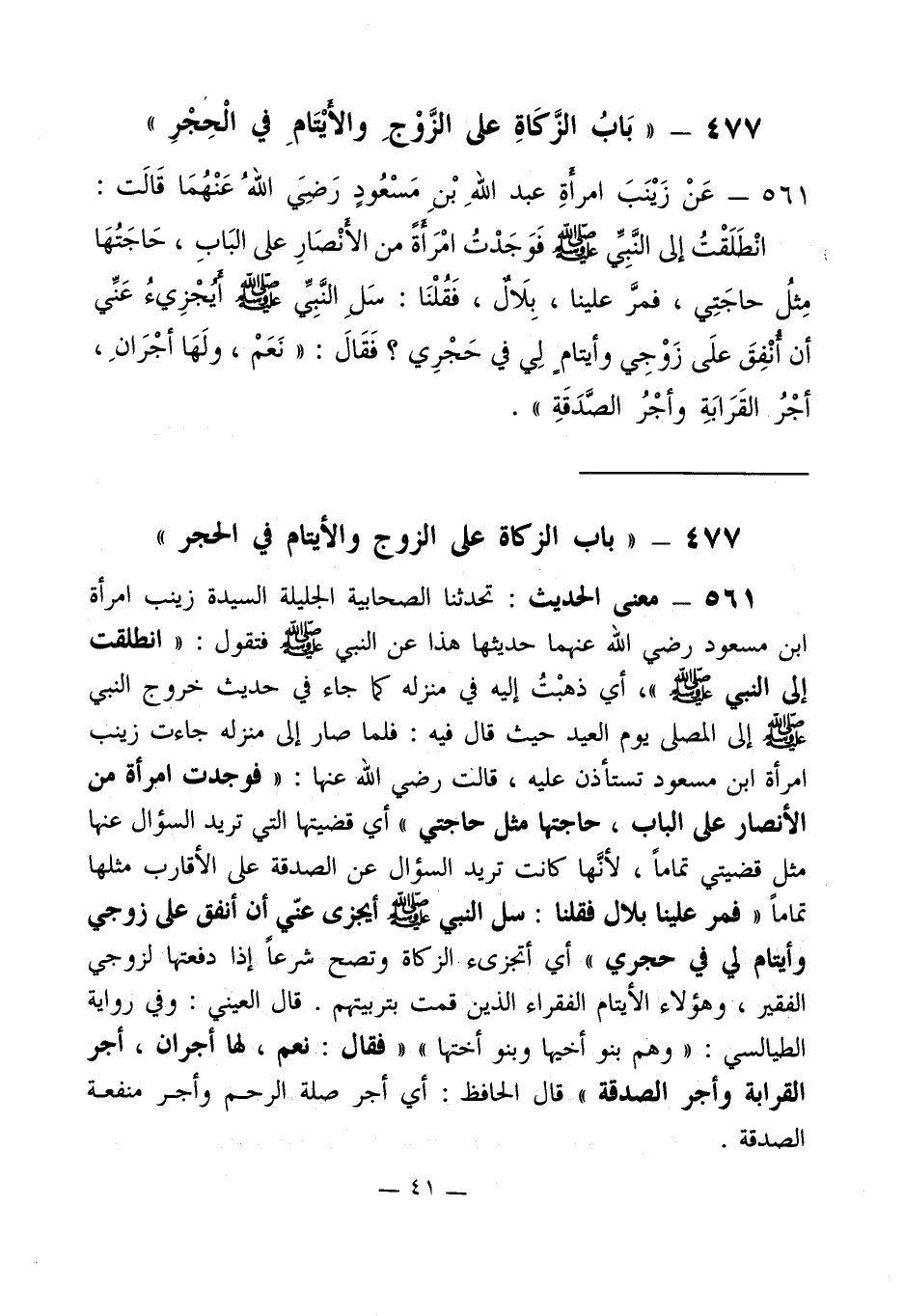 561 - معنى الحديث: تحدثنا الصحابية الجليلة السيدة زينب امرأة ابن مسعود رضي الله عنهما حديثها هذا عن النبي - صلى الله عليه وسلم - فتقول: " انطلقت إلى النبي - صلى الله عليه وسلم - "، أي ذهبْتُ إليه في منزله كما جاء في حديث خروج النبي - صلى الله عليه وسلم - إلى المصلى يوم العيد حيث قال فيه: فلما صار إلى منزله جاءت زينب امرأة ابن مسعود تستأذن عليه، قالت رضي الله عنها: " فوجدت امرأة من الأنصار على الباب، حاجتها مثل حاجتي " أي قضيتها التي تريد السؤال عنها مثل قضيتي تماماً، لأنَّها كانت تريد السؤال عن الصدقة على الأقارب مثلها تماماً " فمر علينا بلال فقلنا: سل النبي - صلى الله عليه وسلم - أيجزى عنّي أن أنفق على زوجي وأيتام لي في حجري " أي أتجزىء الزكاة وتصح شرعاً إذا دفعتها لزوجي الفقير، وهؤلاء الأيتام الفقراء الذين قمت بتربيتهم. قال العيني: وفي رواية الطيالسي: " وهم بنو أخيها وبنو أختها " " فقال: نعم، لها أجران، أجر القرابة وأجر الصدقة " قال الحافظ: أي أجر صلة الرحم وأجر منفعة الصدقة.