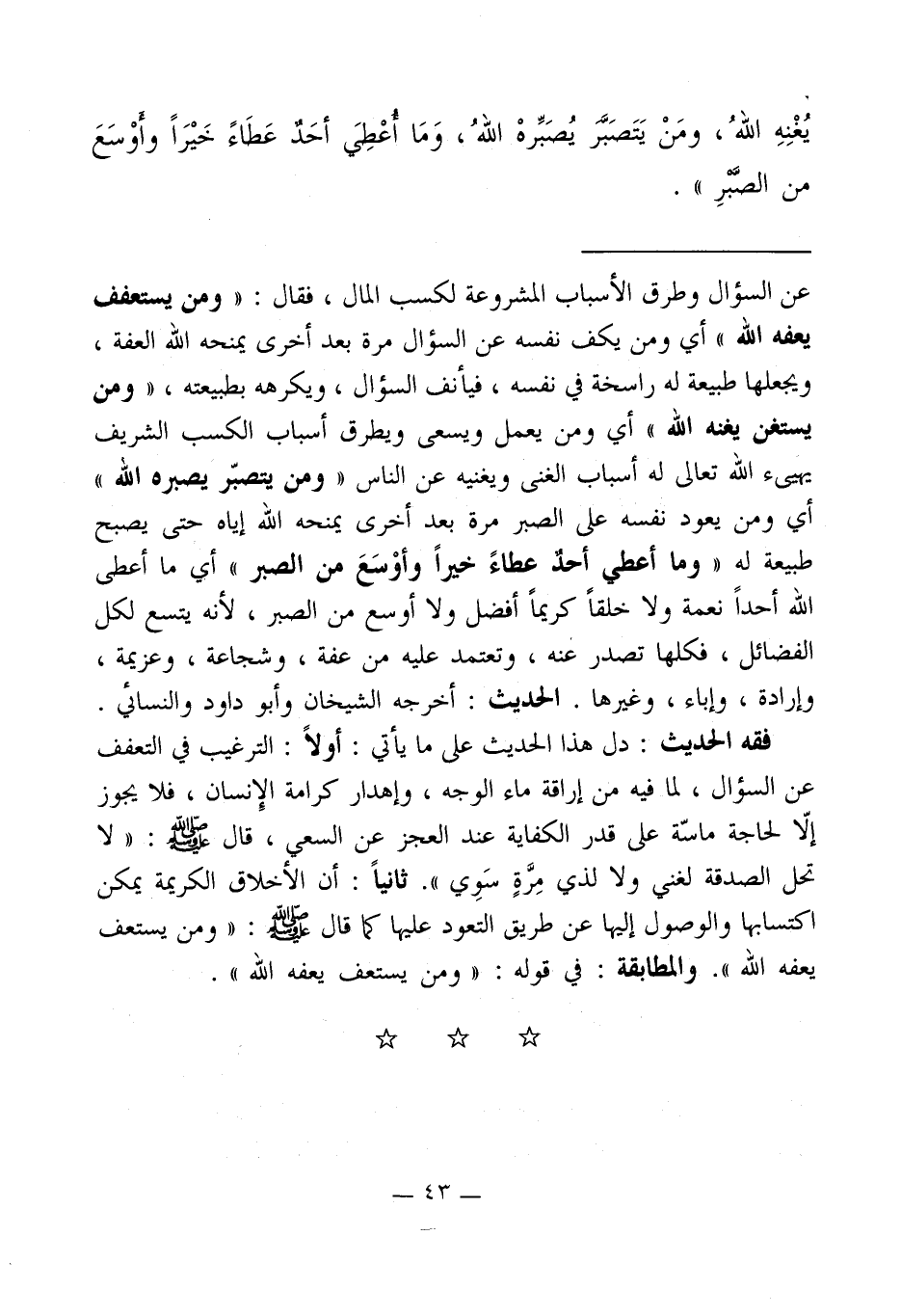 عن السؤال وطرق الأسباب المشروعة لكسب المال، فقال: " ومن يستعفف يعفه الله " أي ومن يكف نفسه عن السؤال مرة بعد أخرى يمنحه الله العفة، ويجعلها طبيعة له راسخة في نفسه، فيأنف السؤال، ويكرهه بطبيعته، "ومن يستغن يغنه الله " أي ومن يعمل ويسعى ويطرق أسباب الكسب الشريف يهيىء الله تعالى له أسباب الغنى ويغنيه عن الناس "ومن يتصبّر يصبره الله" أي ومن يعود نفسه على الصبر مرة بعد أخرى يمنحه الله إياه حتى يصبح طبيعة له " وما أعطي أحدٌ عطاءً خيراً وأوْسَعَ من الصبر " أي ما أعطى الله أحداً نعمة ولا خلقاً كريماً أفضل ولا أوسع من الصبر، لأنه يتسع لكل الفضائل، فكلها تصدر عنه، وتعتمد عليه من عفة، وشجاعة، وعزيمة، وإرادة، وإباء، وغيرها. الحديث: أخرجه الشيخان وأبو داود والنسائي.