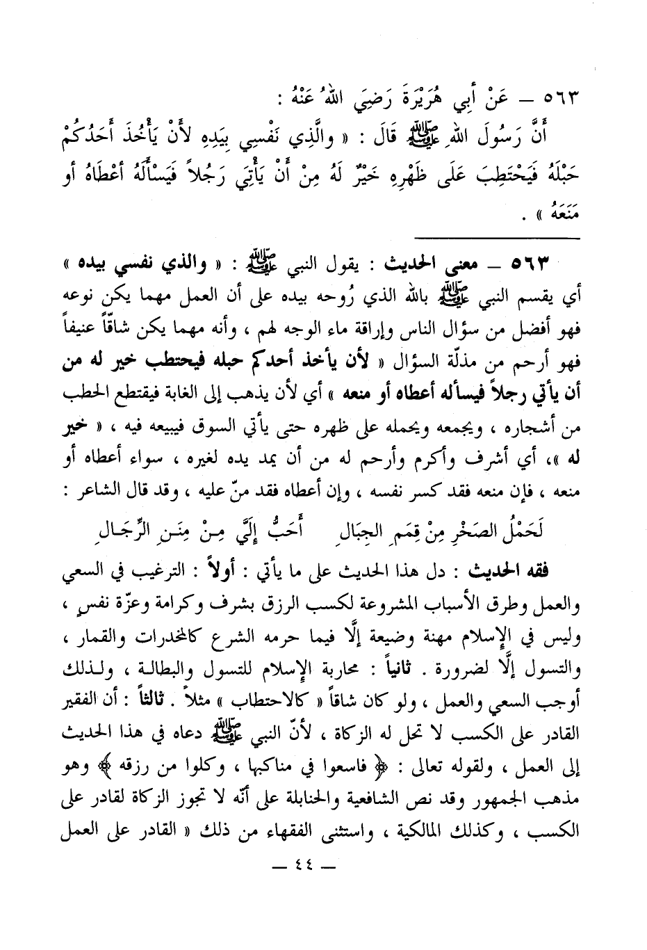 563 - معنى الحديث: يقول النبي - صلى الله عليه وسلم -: "والذي نفسي بيده" أي يقسم النبي - صلى الله عليه وسلم - بالله الذي روحه بيده على أن العمل مهما يكن نوعه فهو أفضل من سؤال الناس وإراقة ماء الوجه لهم، وأنه مهما يكن شاقّاً عنيفاً فهو أرحم من مذلّة السؤال " لأن يأخذ أحدكم حبله فيحتطب خير له من أن يأتي رجلاً فيسأله أعطاه أو منعه " أي لأن يذهب إلى الغابة فيقتطع الحطب من أشجاره، ويجمعه ويحمله على ظهره حتى يأتي السوق فيبيعه فيه، " خير له "، أي أشرف وأكرم وأرحم له من أن يمد يده لغيره، سواء أعطاه أو منعه، فإن منعه فقد كسر نفسه، وإن أعطاه فقد منّ عليه، وقد قال الشاعر: