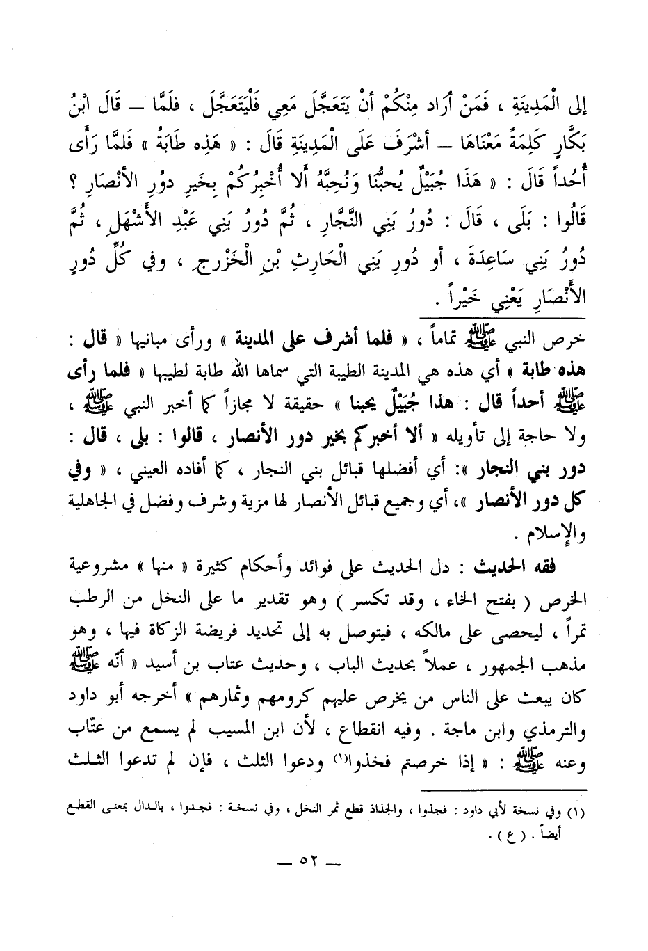 خرص النبي - صلى الله عليه وسلم - تماماً، " فلما أشرف على المدينة " ورأى مبانيها " قال: هذهْ طابة " أي هذه هي المدينة الطيبة التي سماها الله طابة لطيبها " فلما رأى - صلى الله عليه وسلم - أحداً قال: هذا جُبَيْلٌ يحبنا " حقيقة لا مجازاً كما أخبر النبي - صلى الله عليه وسلم -، ولا حاجة إلى تأويله " ألا أخبركم بخير دور الأنصار، قالوا: بلى، قال: دور بني النجار ": أي أفضلها قبائل بني النجار، كما أفاده العيني، " وفي كل دور الأنصار "، أي وجميع قبائل الأنصار لها مزية وشرف وفضل في الجاهلية والِإسلام.