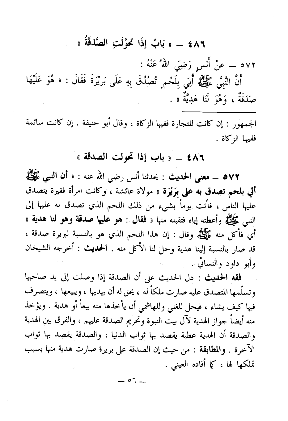 أن النَّبِيَّ - صلى الله عليه وسلم - أتِي بِلَحْمٍ تُصُدِّقَ بِهِ عَلَى بَريْرَةَ فَقَالَ: " هُوَ عَلَيْهَا صَدَقَة، وَهُوَ لَنَا هَدِيَّة ".