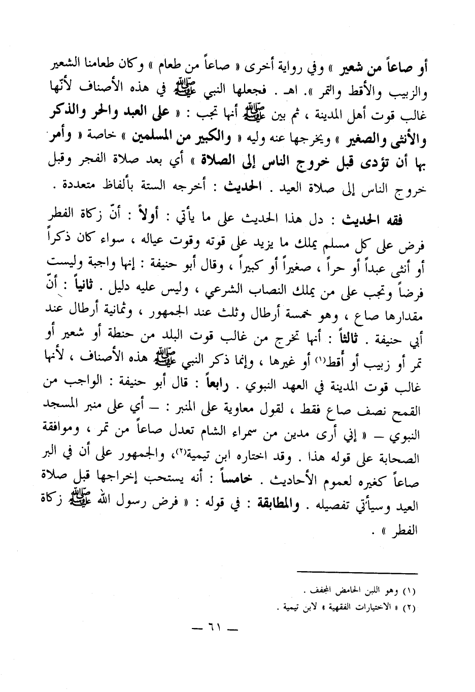 أو صاعاً من شعير" وفي رواية أخرى " صاعاً من طعام " وكان طعامنا الشعير والزبيب والأقط والتمر ". اهـ. فجعلها النبي - صلى الله عليه وسلم - في هذه الأصناف لأنّها غالب قوت أهل المدينة، ثم بين - صلى الله عليه وسلم - أنها تجب: " على العبد والحر والذكر والأنثى والصغير " ويخرجها عنه وليه " والكبير من المسلمين " خاصة " وأمر بها أن تؤدى قبل خروج الناس إلى الصلاة " أي بعد صلاة الفجر وقبل خروج الناس إلى صلاة العيد. الحديث: أخرجه الستة بألفاظ متعددة.