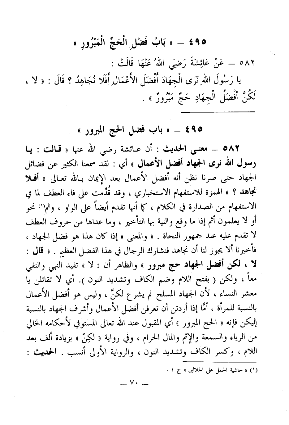582 - معنى الحديث: أن عائشة رضي الله عنها " قالت: يا رسول الله نرى الجهاد أفضل الأعمال " أي: لقد سمعنا الكثير عن فضائل الجهاد حتى صرنا نظن أنه أفضل الأعمال بعد الإيمان بالله تعالى " أفلا نجاهد؟ " الهمزة للاستفهام الاستخباري، وقد قُدِّمت على فاء العطف لما في الاستفهام من الصدارة في الكلام، كما أنها تقدم أيضاًً على الواو، وثم (¬1) نحو أو لا يعلمون أثم إذا ما وقع والنية بها التأخير، وما عداها من حروف العطف لا تقدم عليه عند جمهور النحاة. " والمعنى " إذا كان هذا هو فضل الجهاد، فأخبرنا ألا يجوز لنا أن نجاهد فنشارك الرجال في هذا الفضل العظيم. " قال: لا، لكن أفضل الجهاد حج مبرور " والظاهر أن " لا " تفيد النهي والنفي معاً، ولكن (بفتح اللام وضم الكاف وتشديد النون). أي لا تقاتلن يا معشر النساء، لأن الجهاد المسلح لم يشرع لكنَّ، وليس هو أفضل الأعمال بالنسبة للمرأة، أمَّا إذا أردتن أن تعرفن أفضل الأعمال وأشرف الجهاد بالنسبة إليكن فإنه " الحج المبرور " أي المقبول عند الله تعالى المستوفي لأحكامه الخالي من الرياء والسمعة والإِثم والمال الحرام، وفي رواية " لكِنّ " بزيادة ألف بعد اللام، وكسر الكاف وتشديد النون، والرواية الأولى أنسب. الحديث: