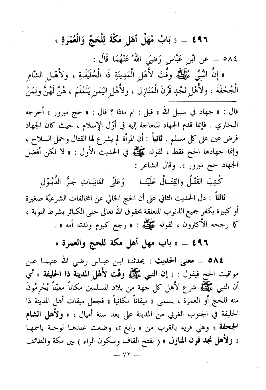 584 - معنى الحديث: يحدثنا ابن عباس رضي الله عنهما عن مواقيت الحج فيقول: " إن النبي - صلى الله عليه وسلم - وقّت لأهلِ المدينة ذا الحليفة " أي أن النبي - صلى الله عليه وسلم - شرع لأهل كل جهة من بلاد المسلمين مكاناً معيّناً يُحْرِمُونَ منه للحج أو العمرة، يسمى " ميقاتاً مكانياً " فجعل ميقات أهل المدينة ذا الحليفة في الجنوب الغربي من المدينة على بعد ستة أميال، " ولأهل الشام الجحفة " وهي قرية بالقرب من " رابغ "، وضعت عندها لوحة باسمها " ولأهل نجد قرن المنازل " (بفتح القاف وسكون الراء) بين مكة والطائف