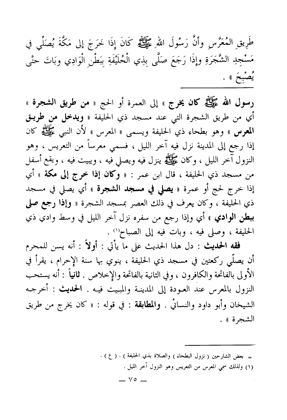طَرِيقِ المُعَرَّسِ وأنَّ رَسُولَ اللهِ - صلى الله عليه وسلم - كَانَ إِذَا خَرَجَ إلى مَكَّةَ يُصَلِّي في مَسْجِدِ الشَّجَرَةِ وِإذَا رَجَعَ صَلَّى بِذِي الْحُلَيْفَةِ بِبَطْنِ الْوَادِي وبَاتَ حتَّى يُصْبِحَ".