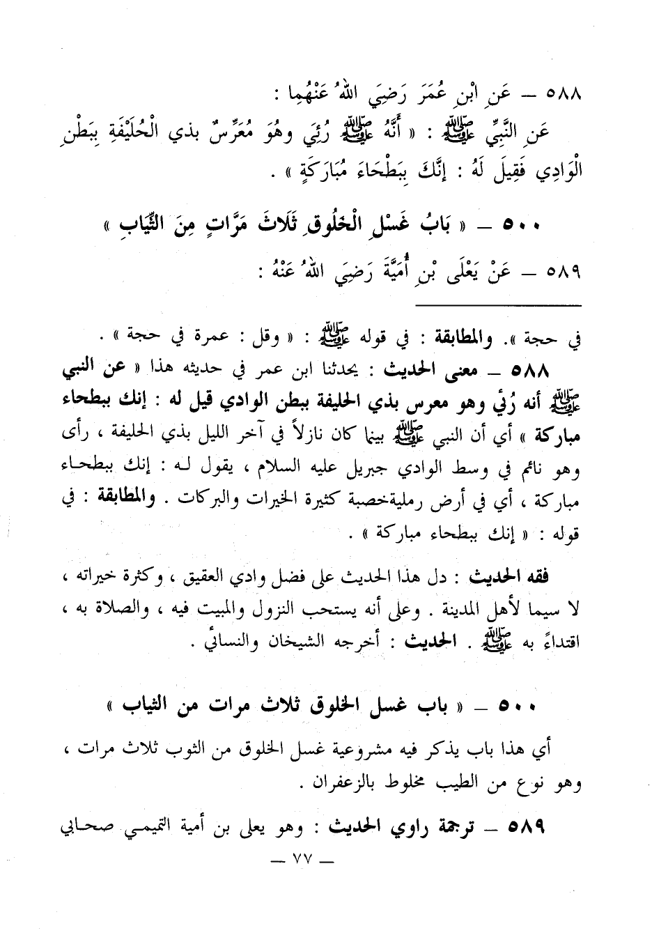 588 - معنى الحديث: يحدثنا ابن عمر في حديثه هذا " عن النبي - صلى الله عليه وسلم - أنه رُئي وهو مُعَرِّسٌ بذي الحليفة ببطن الوادي قيل له: إنك ببطحاء مباركة " أي أن النبي - صلى الله عليه وسلم - بينما كان نازلاً في آخر الليل بذي الحليفة، رأى وهو نائم في وسط الوادي جبريل عليه السلام، يقول له: إنك ببطحاء مباركة، أي في أرض رملية خصبة كثيرة الخيرات والبركات. والمطابقة: في قوله: " إنك ببطحاء مباركة ".