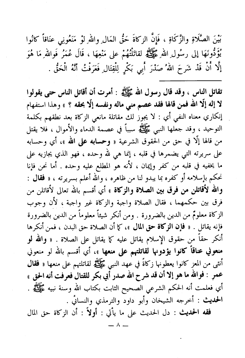 تقاتل الناس، وقد قال رسول الله - صلى الله عليه وسلم -: أمرت أن أقاتل الناس حتى يقولوا لا إله إلاّ الله فمن قالها فقد عصم مني ماله ونفسه إلاّ بحقه؟ " وهذا استفهام إنكاري معناه النفي أي: لا يجوز لك مقاتلة مانعي الزكاة بعد نطقهم بكلمة التوحيد، وقد جعلها النبي - صلى الله عليه وسلم - سبباً في عصمة الدماء والأموال، فلا يقتل من قالها إلاّ في حق من الحقوق الشرعية " وحسابه على الله "، أي وحسابه على سريرته التي يضمرها في قلبه، إنما هي لله وحده، فهو الذي يجازيه على ما يخفيه في قلبه من كفر وإيمان، لأنه هو المطلع عليه وحده. أما نحن فإنا نحكم بإسلامه أو كفره بما يبدو لنا من ظاهره، والله أعلم بسريرته، " فقال: والله لأقاتلن من فرق بين الصلاة والزكاة " أي أقسم بالله تعالى لأقاتلن من فرق بين حكمهما، فقال الصلاة واجبة والزكاة غير واجبة، لأن وجوب الزكاة معلومٌ من الدين بالضرورة. ومن أنكر شيئاً معلوماً من الدين " بالضرورة فإنه يقاتلِ. " فإن الزكاة حق المال "، كما أن الصلاة حق البدن، فمن أنكرها أنكر حقاً من حقوق الإِسلام يقاتل عليه كما يقاتل على الصلاة. " والله لو منعوني عناقاً كانوا يؤدونها لقاتلتهم كل منعها "، أي أقسم بالله لو منعوني أنثى من المعز كانوا يعطونها زكاةً في عهد النبي - صلى الله عليه وسلم - لقاتلتهم على منعها " فقال عمر: فوالله ما هو إلا أن قد شرح الله صدر أبي بكر للقتال فعرفت أنه الحق " أي فعلمت أنه الحكم الشرعي الصحيح الثابت بكتاب الله وسنة نبيه - صلى الله عليه وسلم -. الحديث: أخرجه الشيخان وأبو داود والترمذي والنسائي.