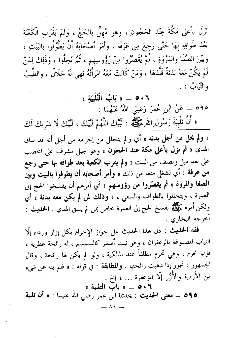" ولم يحل من أجل بدنه " أي ولم يتحلل من إحرامه من أجل أنه قد ساق الهدي " ثم نزل بأعلى مكة عند الحجون " وهو جبل مشرف على المحصب على بعد ميل ونصف من البيت " ولم يقرب الكعبة بعد طوافه بها حتى رجع من عرفة " أي لشغلٍ منعه من ذلك " وأمر أصحابه أن يطوفوا بالبيت وبين الصفا والمروة " ثم يقصّروا من رؤوسهم " أي أمرهم أن يفسخوا الحج إلى العمرة، ويتحللوا بالطواف والسعي، " وذلك لمن لم يكن معه بدنة " أي ولكن أمره - صلى الله عليه وسلم - بفسخ الحج إلى العمرة خاص بمن لم يسق الهدي. الحديث: أخرجه البخاري.
