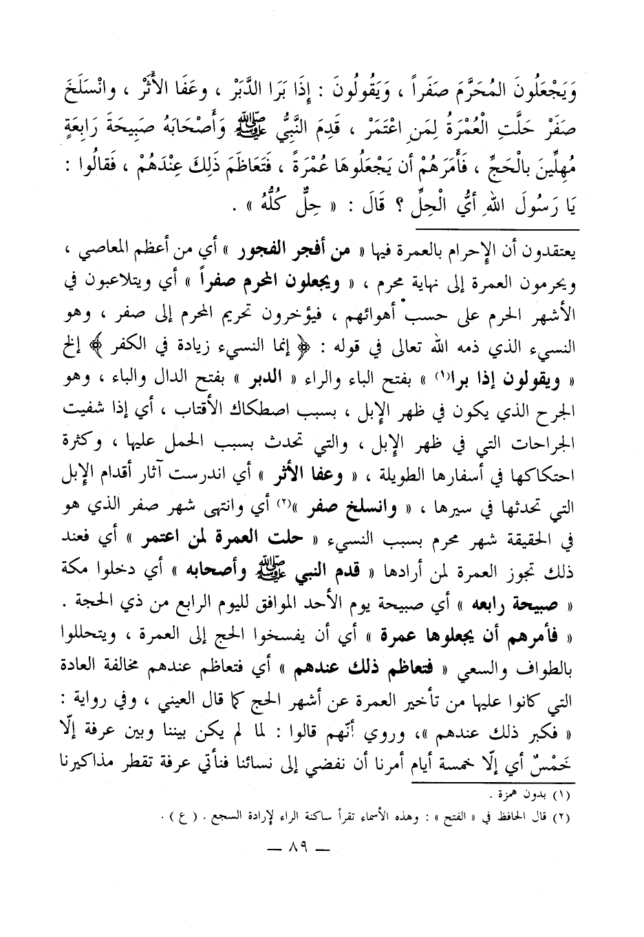 وَيَجْعَلُونَ المُحَرَّمَ صَفَراً، وَيَقُولُونَ: إِذَا بَرَا الدَّبَرْ، وعَفَا الأَثَرْ، وانْسَلَخَ صَفَرْ حَلَّتِ الْعُمْرَةُ لِمَنِ اعْتَمَرْ، قَدِمَ النَّبِيُّ - صلى الله عليه وسلم - وَأَصْحَابَهُ صَبِيحَةَ رَابِعَةٍ مُهِلِّينَ بالْحَجِّ، فَأمرَهُمْ أن يَجْعَلُوهَا عُمْرَةً، فَتَعَاظَمَ ذَلِكَ عنْدَهُمْ، فَقالُوا: يَا رَسُولَ اللهِ أيُّ الْحِلِّ؟ قَالَ: " حِلٌّ كُلُّهُ ".