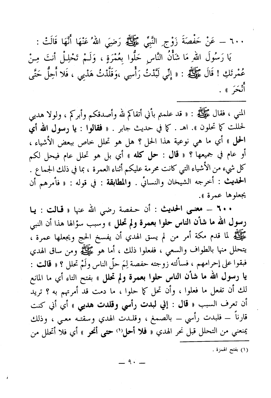 600 - معنى الحديث: أن حفصة رضي الله عنها " قالت: يا رسول الله ما شأن الناس حلوا بعمرة ولم تحلل " وسبب سؤالها هذا أن النبي - صلى الله عليه وسلم - لما قدم مكة أمر من لم يسق الهدي أن يفسخ الحج ويجعلها عمرة، يتحلل منها بالطواف والسعي، ففعلوا ذلك، أما هو - صلى الله عليه وسلم - ومن ساق الهدي فبقوا على إحرامهم، فسألته زوجته حفصة لِمَ حلّ الناس ولَمْ تحلل؟ " قالت: يا رسول الله ما شأن الناس حلوا بعمرة ولم تحلل " بفتح التاء أي ما المانع لك أن تفعل ما فعلوا، وأن تحل كما حلوا، ما دمت قد أمرتهم به؟ تريد أن تعرف السبب " قال: إني لبدت رأسي وقلدت هديي " أي أني كنت قارناً -فلبدت رأسي- بالصمغ، وقلدت الهدي وسقته معي، وذلك يمنعني من التحلل قبل نحر الهدي " فلا أحل (¬1) حتى أنحر " أي فلا أتحلل من