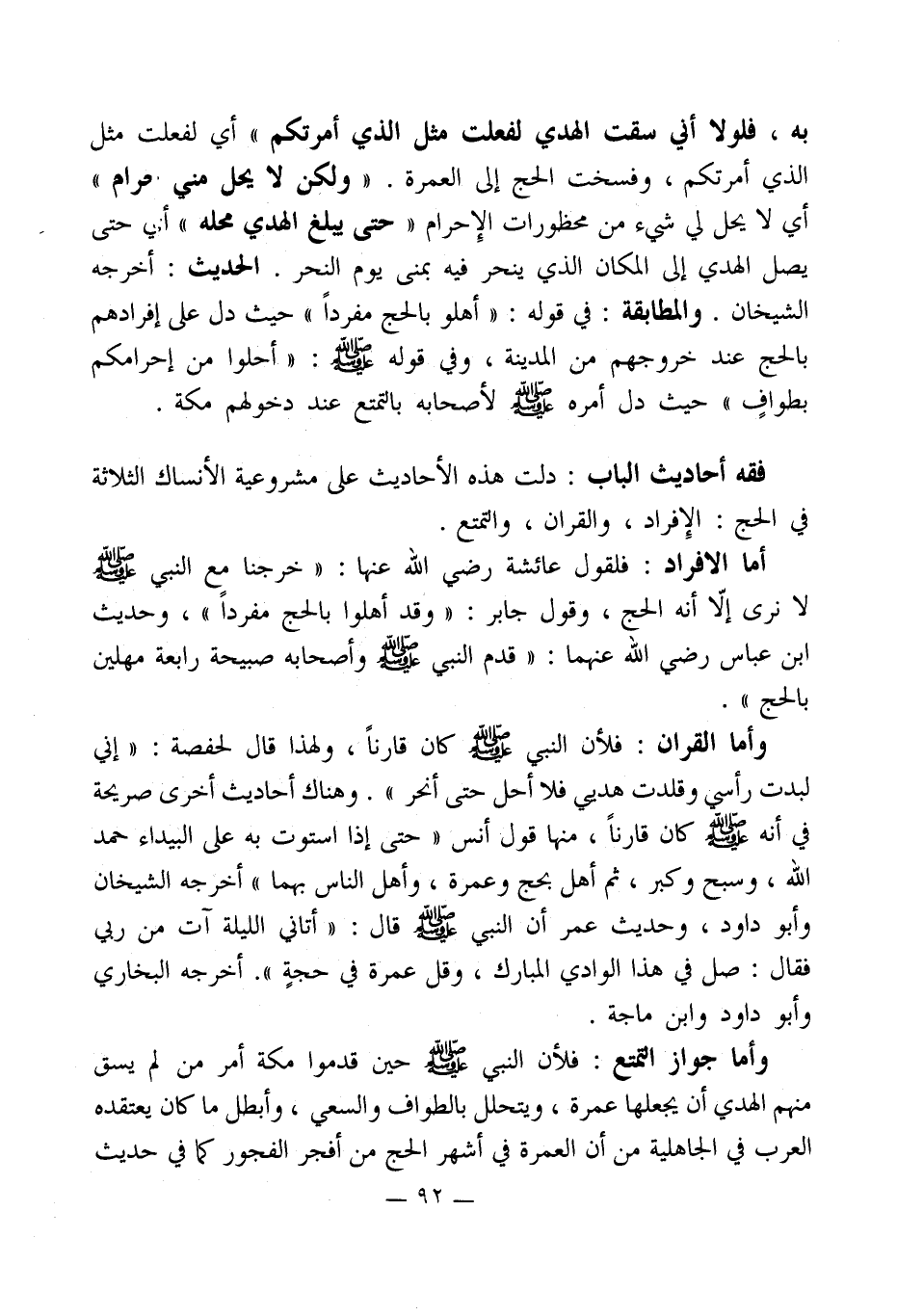 وأما القران: فلأن النبي - صلى الله عليه وسلم - كان قارناً، ولهذا قال لحفصة: " إني لبدت رأسي وقلدت هديي فلا أحل حتى أنحر ". وهناك أحاديث أخرى صريحة في أنه - صلى الله عليه وسلم - كان قارناً، منها قول أنس " حتى إذا استوت به على البيداء حمد الله، وسبح وكبر، ثم أهل بحج وعمرة، وأهل الناس بهما " أخرجه الشيخان وأبو داود، وحديث عمر أن النبي - صلى الله عليه وسلم - قال: " أتاني الليلة آت من ربي فقال: صل في هذا الوادي المبارك، وقل عمرة في حجةٍ ". أخرجه البخاري وأبو داود وابن ماجة.