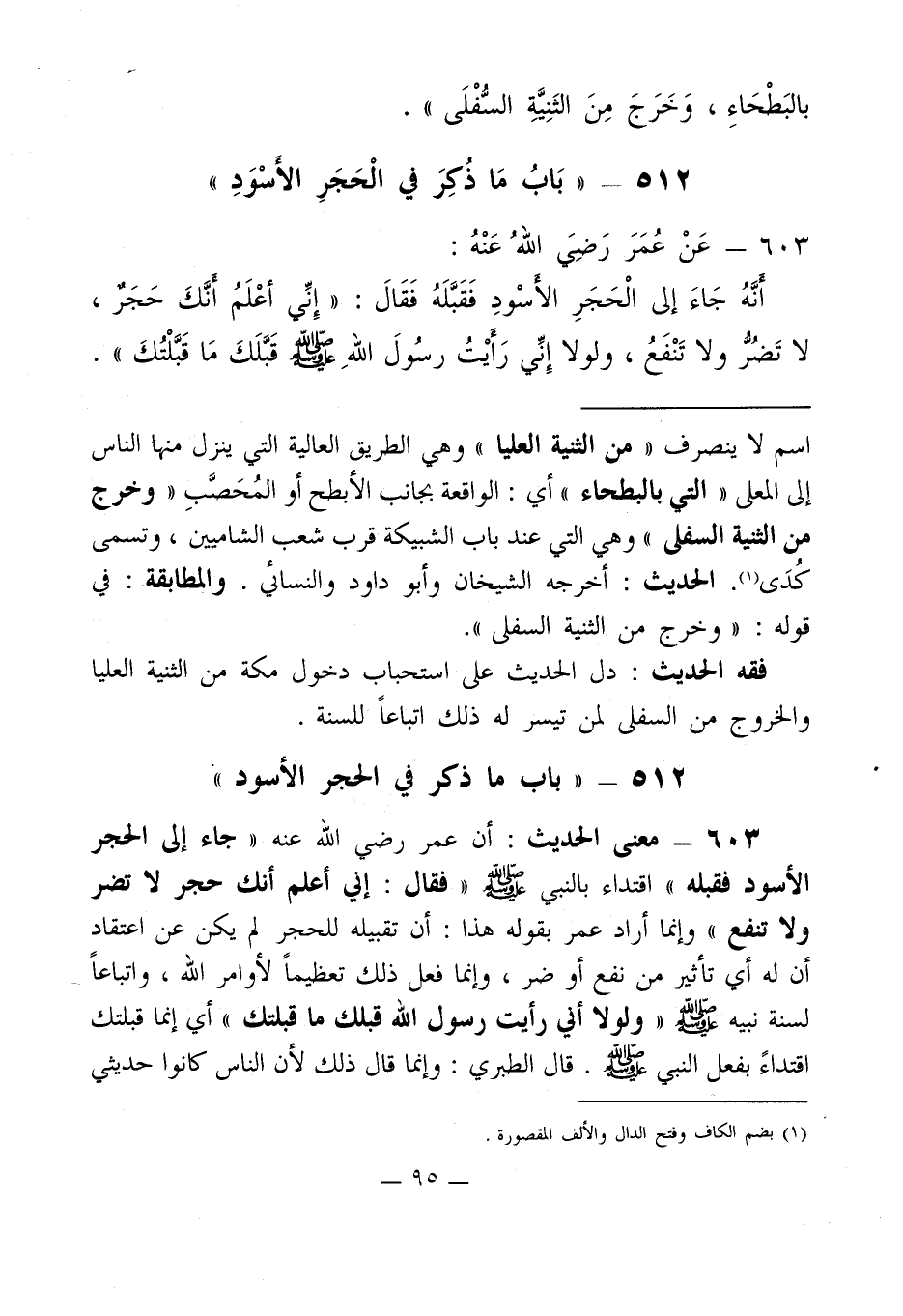 603 - معنى الحديث: أن عمر رضي الله عنه " جاء إلى الحجر الأسود فقبله " اقتداء بالنبي - صلى الله عليه وسلم - " فقال: إني أعلم أنك حجر لا تضر ولا تنفع " وإنما أراد عمر بقوله هذا: أن تقبيله للحجر لم يكن عن اعتقاد أن له أي تأثير من نفع أو ضر، وإنما فعل ذلك تعظيماً لأوامر الله، واتباعاً لسنة نبيه - صلى الله عليه وسلم - " ولولا أني رأيت رسول الله قبلك ما قبلتك " أي إنما قبلتك اقتداءً بفعل النبي - صلى الله عليه وسلم -. قال الطبري: وإنما قال ذلك لأن الناس كانوا حديثي