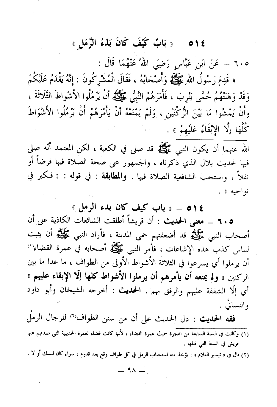605 - معنى الحديث: أن قريشاً أطلقت الشائعات الكاذبة على أن أصحاب النبي - صلى الله عليه وسلم - قد أضعفتهم حمى المدينة، فأراد النبي - صلى الله عليه وسلم - أن يثبت للناس كذب هذه الإشاعات، فأمر النبي - صلى الله عليه وسلم - أصحابه في عمرة القضاء (¬1) أن يرملوا أي يسرعوا في الثلاثة الأشواط الأولى من الطواف، ما عدا ما بين الركنين " ولم يمنعه أن يأمرهم أن يرملوا الأشواط كلها إلاّ الإبقاء عليهم " أي إلاّ الشفقة عليهم والرفق بهم. الحديث: أخرجه الشيخان وأبو داود والنسائي.