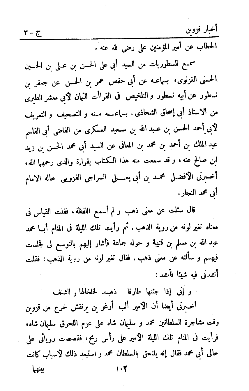 سمع للطوريات من السيد أبي علي الحسن بْن علي بْن الحسين الحسني الغزنوي بسماعه عن أبي حفص عمر بْن الحسن عن جعفر بْن نسطور عن أبيه نسطور والتلخيص في القراأت الثمان لأبي معشر الطبري من الأستاذ أبي إسحاق الشحاذي بسماعه منه والتصحيف والتعريف لأبي أحمد الحسن بْن عَبْد اللَّه بْن سعيد العسكري من القاضي أبي القاسم عَبْد الملك بْن أحمد بْن محمد بْن المعافى عن السيد أبي محمد الحسن بْن زيد ابن صالح عَنْهُ وقد سمعت منه هذا الكتاب بقراءة والدي رحمهما اللَّه أخبرني الأفضل محمد بْن أبي يعلى السراجي القزويني خاله الإمام أبي محمد النجار.