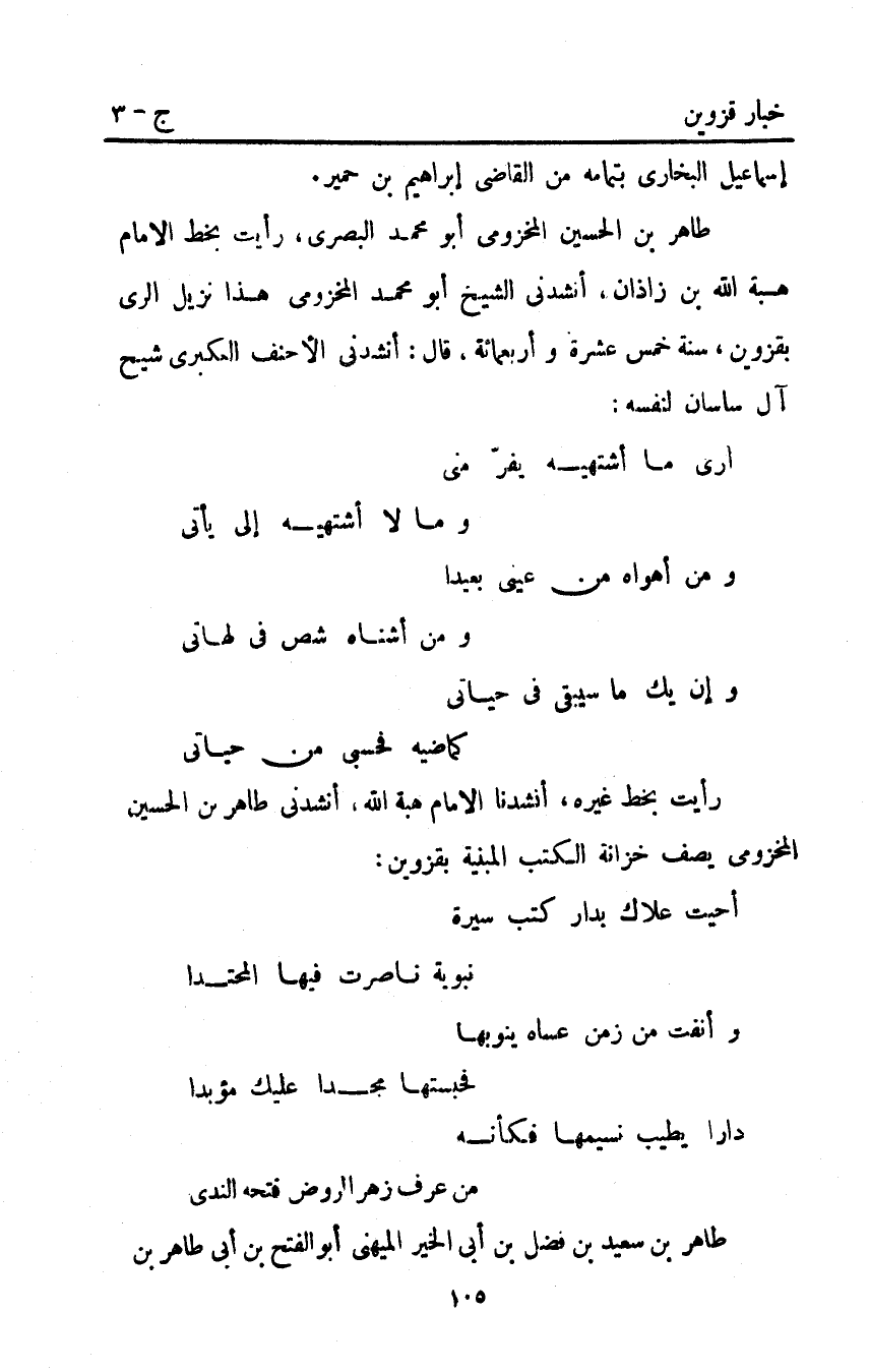 طاهر بْن الحسين المخزومي أَبُو محمد البصري رأيت بخط الإمام هبة اللَّه بْن زاذان أنشدني الشيخ أَبُو محمد المخزومي هذا نزيل الري بقزوين سنة خمس عشرة وأربعمائة قال: أنشدني الأحنف العكبري شيح آل ساسان لنفسه: