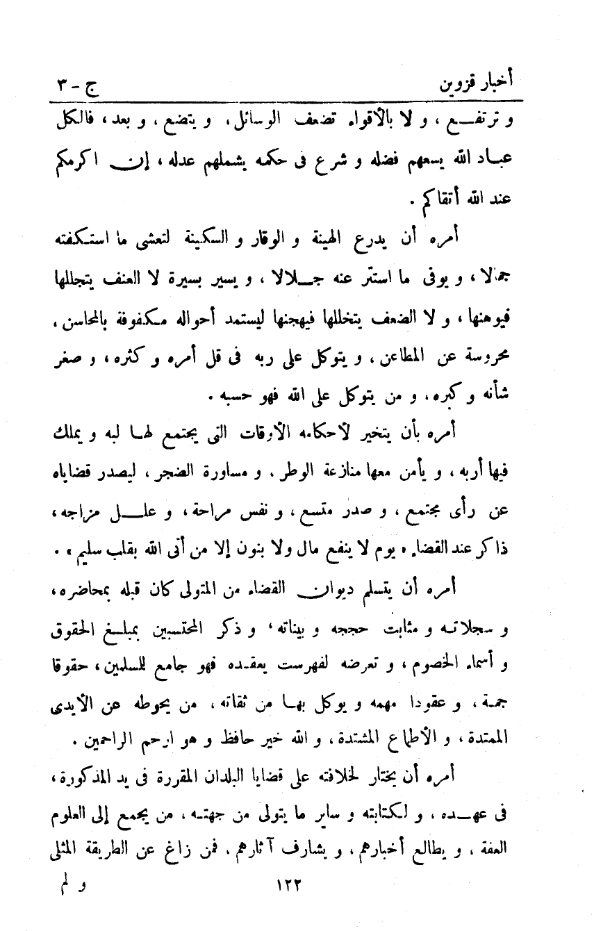 أمره أن يختار لخلافته على قضايا البلدان المقررة في يد المذكورة في عهده ولكتابته وساير مَا يتولى من جهته من يجمع إلى العلوم العفة ويطالع أخبارهم ويشارف آثارهم فمن زاغ عن الطريقة المثلى