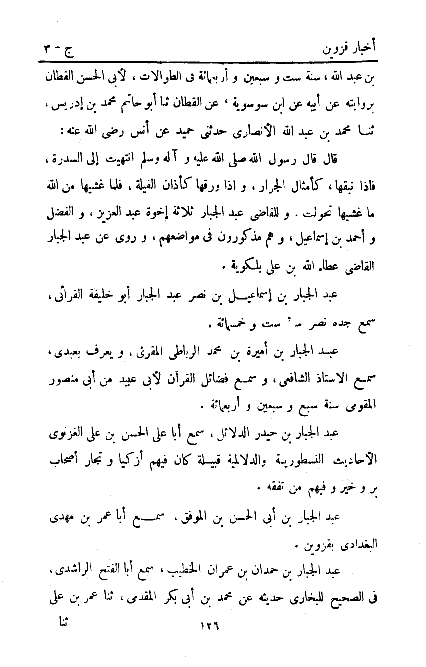 قَالَ قَالَ رَسُولُ اللَّهِ صَلَّى اللَّهُ عَلَيْهِ وَسَلَّمَ: "انْتَهَيْتُ إِلَى السِّدْرَةِ فَإِذَا نَبْقُهَا كَأَمْثَالِ الْجِرَارِ وَإِذَا وَرَقُهَا كَأَذَانِ الْفِيَلَةِ فَلَمَّا غَشِيَهَا مِنَ اللَّهِ مَا غَشِيَهَا تَحَوَّلَتْ" وَلِلْقَاضِي عَبْدِ الْجَبَّارِ ثَلاثَةُ إِخْوَةٍ عَبْدُ الْعَزِيزِ وَالْفَضْلُ وَأَحْمَد بْنُ إِسْمَاعِيل وَهُمْ مَذْكُورُونَ فِي مَوَاضِعِهِمْ وَرَوَى عَنْ عَبْدِ الْجَبَّارِ الْقَاضِي عَطَاءُ اللَّهِ بْنُ علي بلكوية. عبد الجبار بْن إسماعيل بْن نصر عَبْد الجبار أَبُو خليفة القرائي