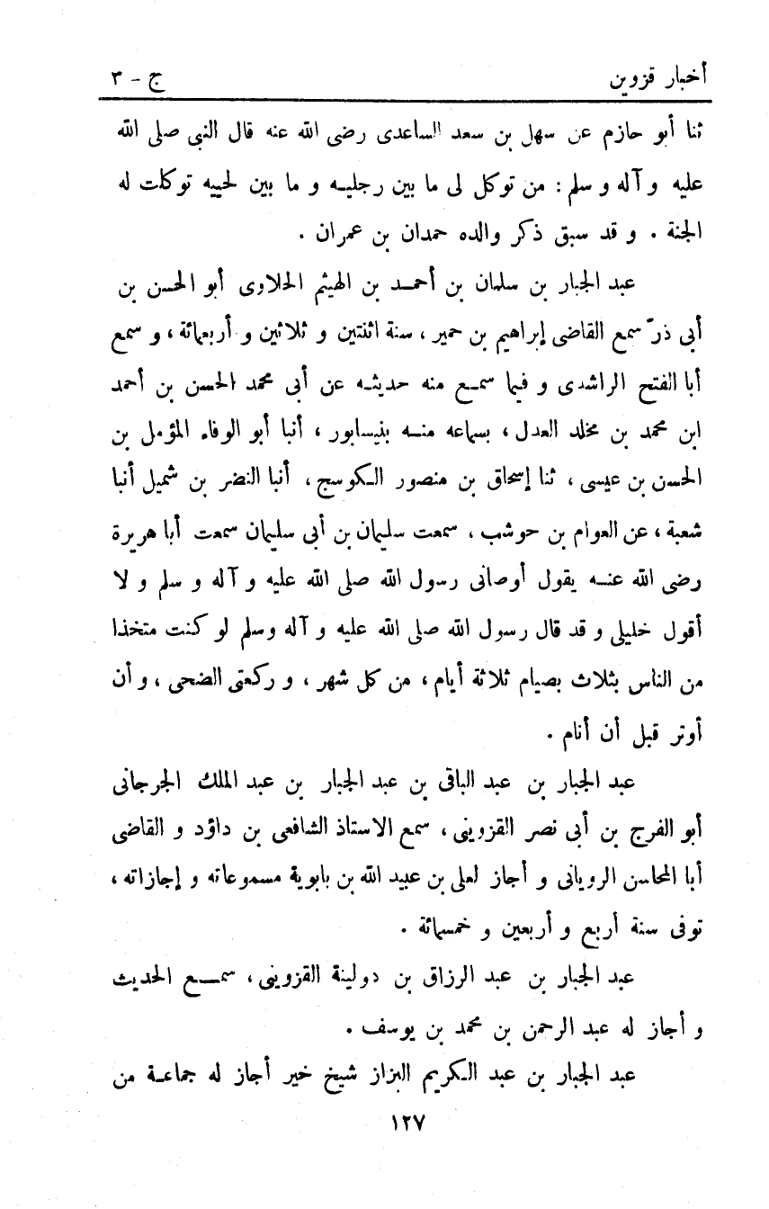 عَبْد الجبار بْن سلمان بْن أَحْمَد بْنِ الْهَيْثَمِ الْحلاوِيُّ أَبُو الْحَسَنِ بْنُ أَبِي ذَرٍّ سَمِعَ الْقَاضِي إبراهيم بْنَ حُمَيِّرٍ سَنَةَ اثنتين وثلاثين وأربعمائة وَسَمِعَ أَبَا الْفَتْحِ الرَّاشِدِيَّ وَفِيمَا سَمِعَ مِنْهُ حَدِيثَهُ عَنْ أَبِي محمد الحسن بن أحمد ابن مُحَمَّدِ بْنِ مَخْلَدٍ الْعَدْلِ بِسَمَاعِهِ مِنْهُ بِنَيْسَابُورَ أنبا أَبُو الْوَفَاءِ الْمُؤَمَّلُ بْنُ الْحَسَنِ بْنِ عِيسَى ثَنَا إِسْحَاقُ بْنُ مَنْصُورٍ الْكَوْسَجُ أنبا النَّضْرُ بْنُ شُمَيْلٍ أنبا شُعْبَةُ عَنِ الْعَوَّامِ بْنِ حَوْشَبٍ سَمِعْتُ سُلَيْمَانَ بْنَ أَبِي سُلَيْمَانَ سَمِعْتُ أَبَا هُرَيْرَةَ رَضِيَ اللَّهُ عَنْهُ يَقُولُ أَوْصَانِي رَسُولُ اللَّهِ صَلَّى اللَّهُ عَلَيْهِ وَآلِهِ وَسَلَّمَ وَلا أَقُولُ خَلِيلِي وَقَدْ قَالَ رَسُولُ اللَّهِ صَلَّى اللَّهُ عَلَيْهِ وَآلِهِ وَسَلَّمَ: "لَوْ كُنْتُ مُتَّخِذًا مِنَ النَّاسِ بِثَلاثٍ بِصِيَامِ ثَلاثَةِ أَيَّامٍ مِنْ كُلِّ شَهْرٍ وَرَكْعَتَيِ الضُّحَى وَأَنْ أُوتِرَ قَبْلَ أَنْ أَنَامَ".