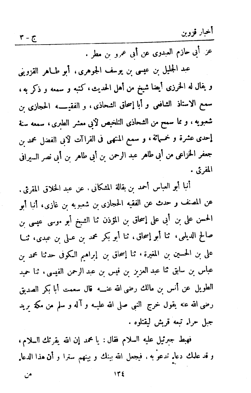 أَنْبَأَ أَبُو الْعَبَّاسِ أَحْمَدُ بْنُ بَقَّالَةَ الْمُشْكَانِيُّ عَنْ عَبْدِ الْخَلاقِ المقرىء عَنِ الْمُصَنِّفِ وَحَدَّثَ عَنِ الْفَقِيهِ الحجازي بْن شعبويه بْن غازي أَنْبَأَ أَبُو الْحَسَنِ عَلِيُّ بْنُ أَبِي عَلِيٍّ إِسْحَاقُ بْنُ الْمُؤَذِّنِ ثَنَا الشَّيْخُ أَبُو مُوسَى عِيسَى بْنُ صَالِحٍ الدَّيْلَمِيُّ ثَنَا أَبُو إِسْحَاقَ ثَنَا أَبُو بَكْرٍ مُحَمَّدُ بْنُ عَلِيِّ بْنِ عَبْدِيٍّ ثَنَا عَلِيُّ بْنُ الْحُسَيْنِ بْنِ الْمُغِيرَةِ ثَنَا إِسْحَاقُ بْنُ إبراهيم الْكُوفِيُّ حَدَّثَنَا مُحَمَّدُ بْنُ عَبَّاسِ بْنِ سَابِقٍ ثَنَا عَبْدُ الْعَزِيزِ بْنُ قَيْسِ بْنِ عَبْدِ الرَّحْمَنِ الْقَيْسِيُّ ثَنَا حُمَيْدٌ الطَّوِيلُ عَنْ أَنَسِ بْنِ مَالِكٍ رَضِيَ اللَّهُ عَنْهُ قَالَ سَمِعْتُ أَبَا بَكْرٍ الصِّدِّيقَ رَضِيَ اللَّهُ عَنْهُ يَقُولُ خَرَجَ النَّبِيَّ صَلَّى اللَّهُ عَلَيْهِ وَآلِهِ وَسَلَّمَ مِنْ مَكَّةَ يُرِيدُ جَبَلَ حِرَاءٍ تَبِعَهُ قُرَيْشٌ لِيَقْتُلُوهُ.