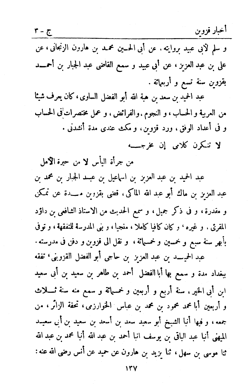 عَبْدُ الْحَمِيدِ بْنُ عَبْدِ الْعَزِيزِ بْنِ حَاجِّيُّ أَبُو الْفَضْلِ الْقَزْوِينِيُّ تَفَقَّهَ بِبَغْدَادَ مُدَّةً وَسَمِعَ بِهَا أَبَا الْفَضْلِ أَحْمَد بْنَ طَاهِرِ بْنِ سَعِيدِ بْنِ أَبِي سعيد ابن أَبِي الْخَيْرِ سَنَةَ أَرْبَعٍ وَأَرْبَعِينَ وخمسمائة وسمع منه سنة ثلاث وأربعين أبا مُحَمَّدٍ مَحْمُودُ بْنُ مُحَمَّدِ بْنِ عَبَّاسٍ الْخَوَارِزْمِيُّ تُحْفَةَ الزَّائِرِ مِنْ جَمْعِهِ وَفِيهَا أنبا الشَّيْخُ أَبُو سَعِيدٍ سَعْدُ بْنُ أَسْعَدَ بْنِ سَعِيدِ بْنِ أَبِي سَعِيدٍ الْمِيهَنِيُّ أَنْبَأَ عَبْدُ الْبَاقِي بْنُ يُوسُفَ أَنْبَا أَحْمَدُ بْنُ عَبْدِ اللَّهِ أَنْبَأَ مُحَمَّدُ بْنُ عَبْدِ اللَّهِ ثَنَا مُوسَى بْنُ سَهْلٍ ثَنَا يَزِيدُ بْنُ هَارُونَ عَنْ حُمَيْدٍ عَنْ أَنَسٍ رَضِيَ اللَّهُ عَنْهُ: