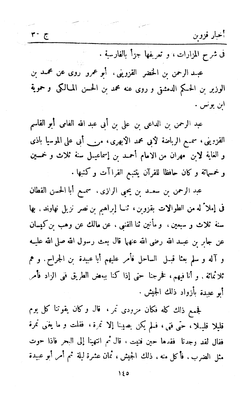 عَبْد الرحمن بْن الداعي بْن علي بْن أبي عَبْد الله الفامى أَبُو القاسم القزويني سمع الرياضة لأبي محمد الأبهري من أبي علي الموسيا باذى والغاية لابن مهران من الإمام أَحْمَد بْن إسماعيل سنة ثلاث وخمسين وخمسمائة وكان حافظا للقرآن يتتبع القراآت وكتبها. عَبْدُ الرَّحْمَنِ بْنُ سَعِيدِ بْنِ يَحْيَى الرَّازِيُّ سَمِعَ أَبَا الْحَسَنِ الْقَطَّانَ فِي إِمْلاءٍ لَهُ مِنَ الطُّوَالاتِ بِقَزْوِينَ ثَنَا إبراهيم بْنُ نَصْرٍ نَزِيلُ نَهَاوَنْدَ بِهَا سنة ثلاث وسبعين ومائتين ثنا القنبي عَنْ مَالِكٍ عَنْ وَهْبِ بْنِ كَيْسَانَ عَنْ جَابِرِ بْنِ عَبْدِ اللَّهِ رَضِيَ اللَّهُ عَنْهُمَا قَالَ بَعَثَ رَسُولُ اللَّهِ صَلَّى اللَّهُ عَلَيْهِ وَآلِهِ وَسَلَّمَ بَعْثًا قِبَلَ السَّاحِلِ فَأَمَّرَ عَلَيْهِمْ أَبَا عُبَيْدَةَ بن الجراح وهم ثلاثمائة وَأَنَا فِيهِمْ فَخَرَجْنَا حَتَّى إِذَا كُنَّا بِبَعْضِ الطَّرِيقِ فَنِيَ الزَّادُ فَأَمَرَ أَبُو عُبَيْدَةَ بِأَزْوَادِ ذَلِكَ الْجَيْشِ.