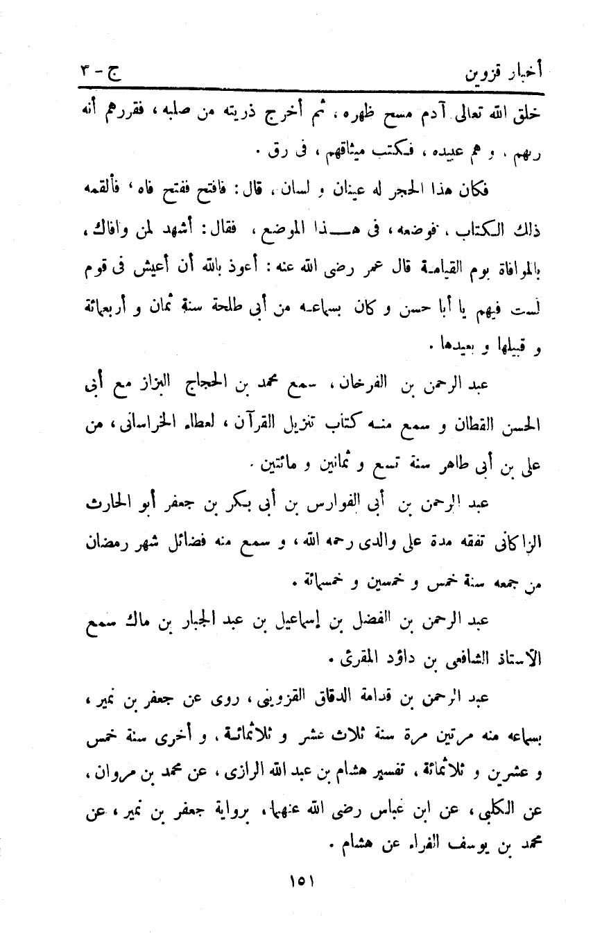 عَبْد الرحمن بْن قدامة الدقاق القزويني روى عن جعفر بْن نمير بسماعه منه مرتين مرة سنة ثلاث عشر وثلاثمائة وأخرى سنة خمس وعشرين وثلاثمائة تفسير هشام بْن عَبْد اللَّهِ الرازي عن محمد بْن مروان عن الكلبي عَنِ ابْنِ عَبَّاسٍ رَضِيَ اللَّهُ عنهما برواية جعفر بْن نمير عن مُحَمَّد بْن يوسف الفراء عن هشام