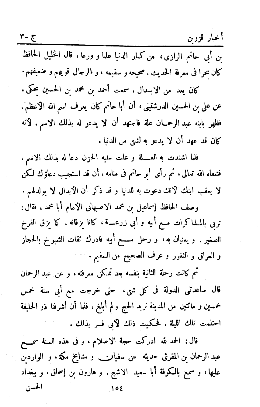 فلما اشتدت به العلة وعلت عليه الحزن دعا له بذلك الاسم فشفاه اللَّه تعالى ثم رأى أَبُو حاتم في منامه أن قد استجيب دعاؤك لكن لا يعقب ابنك لأنك دعوت به للدنيا وقد ذكر أن الأبدال لا يولدهم.