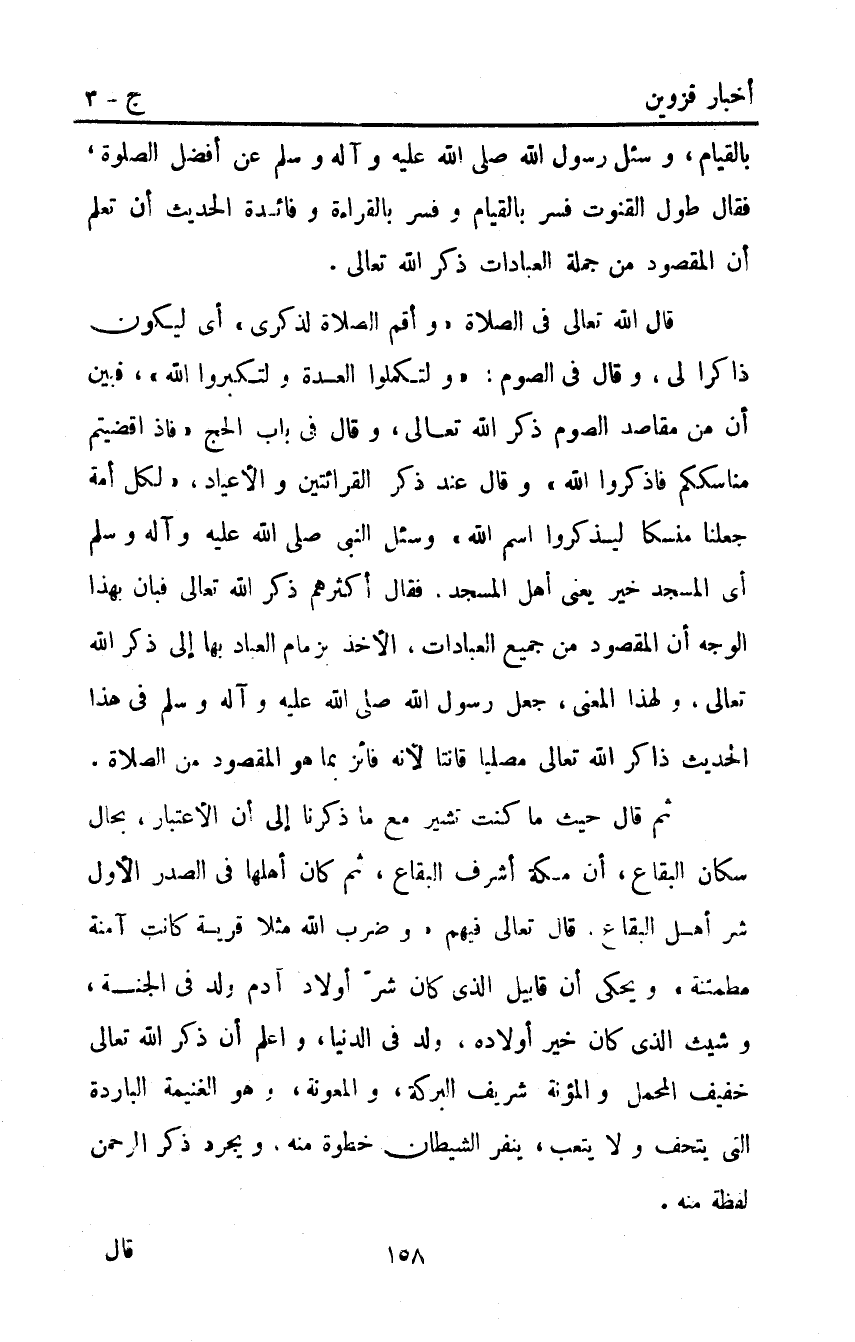 بالقيام وسئل رسول صَلَّى اللَّهُ عَلَيْهِ وَآلِهِ وَسَلَّمَ الله عن أفضل الصلوة فقال: "طول القنوت" فسر بالقيام وفسر بالقراءة وفائدة الحديث أن تعلم أن المقصود من جملة العبادات ذكر اللَّه تعالى.