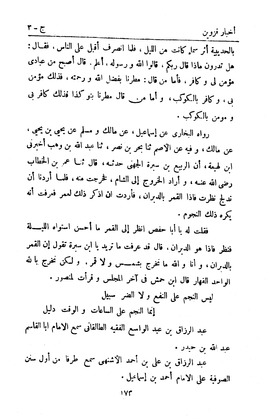 رَوَاهُ الْبُخَارِيُّ عَنْ إِسْمَاعِيل عَنْ مَالِكٍ وَمُسْلِمٍ عَنْ يَحْيَى بْنِ يَحْيَى عَنْ مَالِكٍ وَفِيهِ عن الأصم ثنا بحر بْن نَصْرٍ ثنا عَبْدُ اللَّهِ بْنُ وَهْبٍ أَخْبَرَنِي ابْنُ لَهِيعَةَ أَنَّ الرَّبِيعَ بْنَ سَبْرَةَ الْجُهَنِيَّ حَدَّثَهُ قَالَ ثَنَا عُمَرُ بْنُ الْخَطَّابِ رَضِيَ اللَّهُ عَنْهُ وَأَرَادَ الْخُرُوجَ إِلَى الشَّامِ فَخَرَجْتُ مِنْهُ فَلَمَّا أَرَدْنَا أَنْ نَدْلُجَ نَظَرْتُ فَإِذَا الْقَمَرُ بِالدَّبَرَانِ فَأَرَدْتُ أَنْ أَذْكُرَ ذَلِكَ لِعُمَرَ فَعَرَفْتُ أَنَّهُ يَكْرَه ذلك النُّجُومِ. فَقُلْتُ لَهُ يَا أَبَا حَفْصٍ انْظُرْ إِلَى الْقَمَرِ مَا أحسن استواه اللَّيْلَةَ فَنَظَرَ فَإِذَا هُوَ الدَّبَرَانِ قَالَ قَدْ عَرَفْتُ مَا تُرِيدُ يا ابن سَبْرَةَ تَقُولُ إِنَّ الْقَمَرَ بِالدَّبَرَانِ وَأَنَّا وَاللَّهِ مَا نَخْرُجُ بِشَمْسٍ وَلا قَمَرٍ وَلَكِنْ نَخْرُجُ بِاللَّهِ الْوَاحِدِ الْقَهَّارِ قَالَ ابْنُ حمشٍ فِي آخِرِ الْمَجْلِسِ وَقَرَأْتُ لِمَنْصُورٍ: