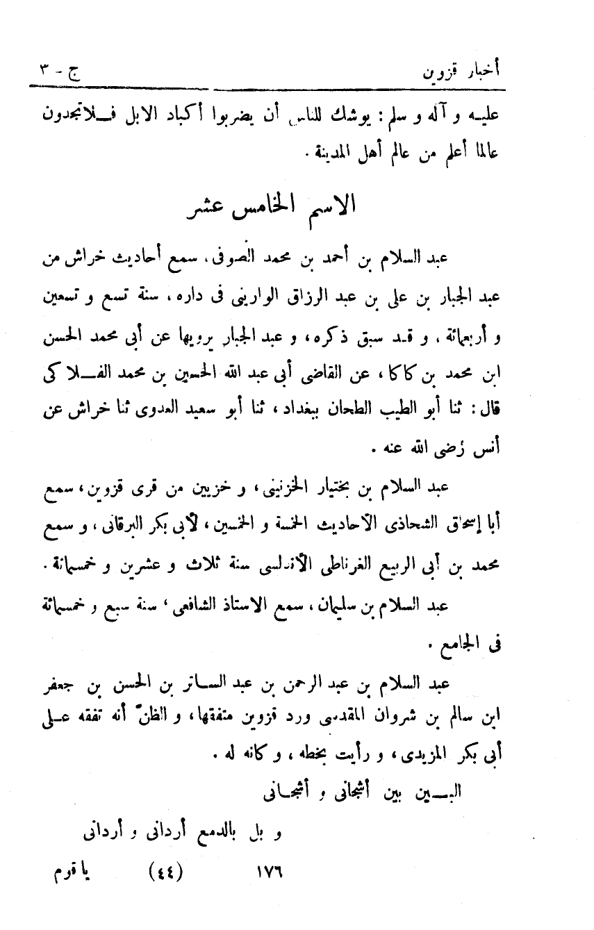عبد السلام بْن أحمد بْن محمد الصوفي سمع أحاديث خراش من عَبْد الجبار بْن علي بْن عَبْد الرزاق الواريني في داره سنة تسع وتسعين وأربعمائة وقد سبق ذكره وعَبْد الجبار يرويها عن أبي محمد الحسن ابن محمد بْن كاكا عن القاضي أبي عَبْد اللَّه الحسين بْن محمد الفلاكي قَالَ ثنا أَبُو الطيب الطحان ببغداد ثنا أَبُو سعيد العدوي ثنا خراش عن أنس رَضِيَ اللَّهُ عَنْهُ. عَبْد السلام بْن بختيار الخزنيني وخزيين من قرى قزوين سمع أبا إسحاق الشحاذي الأحاديث الخمسة والخمسين لأبي بكر البرقاني وسمع محمد بْن أبي الربيع الغرناطي الأندلسي سنة ثلاث وعشرين وخمسمائة.