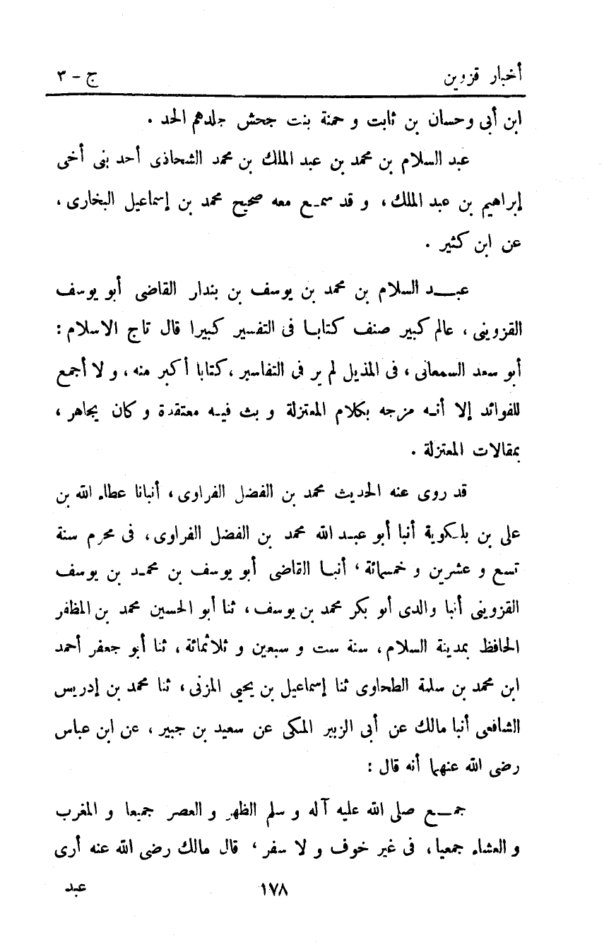 قَدْ رَوَى عَنْهُ الْحَدِيثَ مُحَمَّدُ بْنُ الْفَضْلِ الْفُرَاوِيُّ أَنْبَأَنَا عطاء اللَّه بْن علي بْن بلكُوَيْهِ أنبا أَبُو عَبْدِ اللَّهِ مُحَمَّد بْن الفضل الفراوي فِي محرم سنة تسع وعشرين وخمسمائة أنبا الْقَاضِي أَبُو يُوسُفَ بْنُ مُحَمَّدِ بْنِ يُوسُفَ الْقَزْوِينِيُّ أنبا وَالِدِي أَبُو بَكْرٍ مُحَمَّدُ بْنُ يُوسُفَ ثنا أَبُو الْحُسَيْنِ مُحَمَّدُ بْنُ الْمُظَفَّرِ الْحَافِظُ بِمَدِينَةِ السَّلامِ سنة ست وسبعين وثلاثمائة ثنا أبو جعفر أحمد ابن مُحَمَّدِ بْنِ سَلَمَةَ الطَّحَاوِيُّ ثَنَا إسماعيل بن يحي الْمُزَنِيُّ ثنا مُحَمَّدُ بْنُ إِدْرِيسَ الشَّافِعِيُّ أنبا مَالِكٌ عَنْ أَبِي الزُّبَيْرِ الْمَكِّيِّ عَنْ سَعِيدِ بْنِ جُبَيْرٍ عَنِ ابْنِ عَبَّاسٍ رَضِيَ اللَّهُ عَنْهُمَا أَنَّهُ قَالَ: